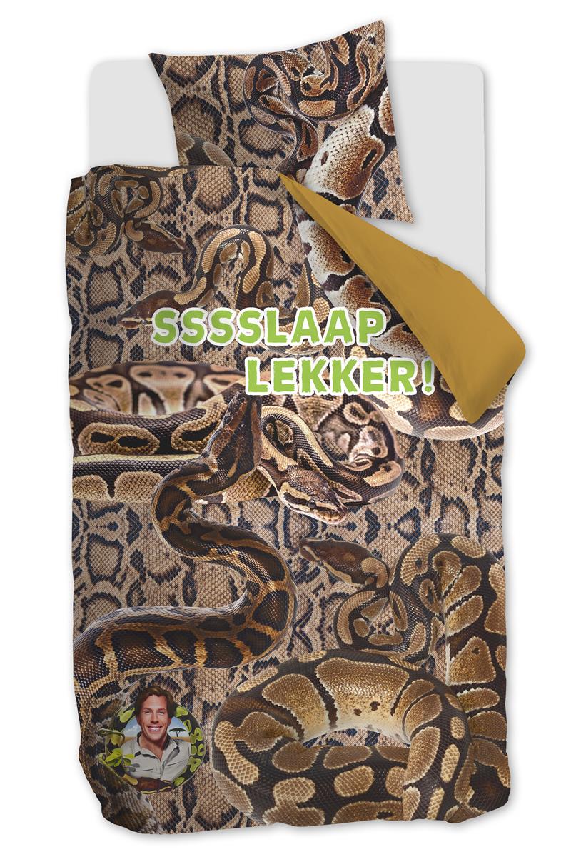 Dit dekbedovertrek krioelt van de slangen, Ssslaap Lekker! De slangen glijden over het dekbedovertrek heen, behalve over de achterkant, want dat is een effen oker kleur. Slaaplekker! Of ga jij nog lang niet sssssslapen?Scan de QR-code op het label voor Freeks verhalen voor het slapengaan.Het dekbedovertrek is verpakt door middel van een FSC-banderol die direct om het setje heen zit. Vouw de banderol helemaal open en ontdek de kleurplaat die als verrassing aan de binnenkant van de verpakking zit. Verpakking niet meer nodig? Gooi deze dan weg bij het oud papier voor recycling.