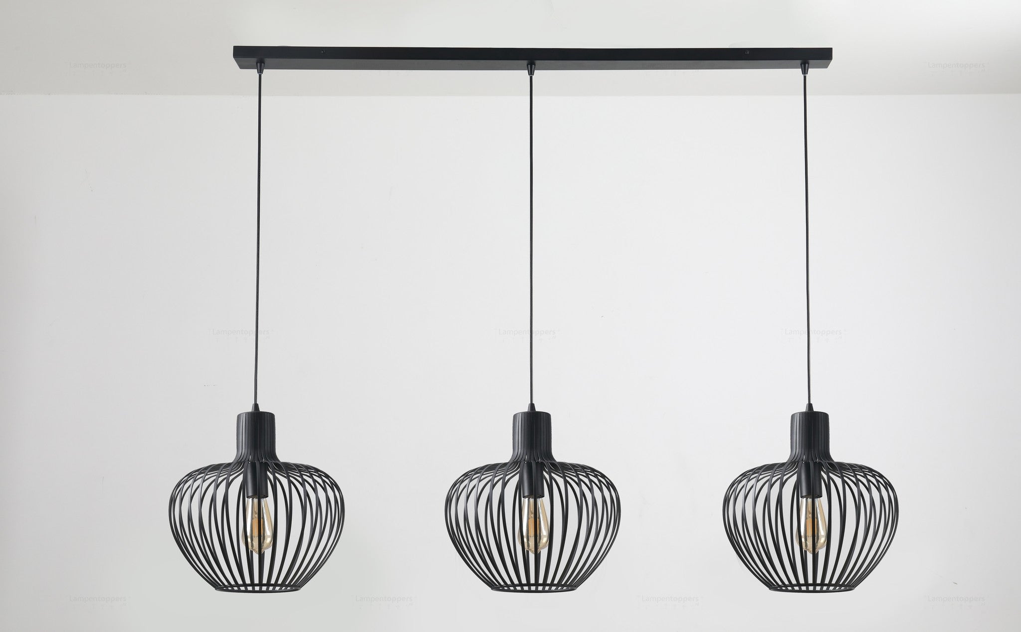 Dit sfeervolle armatuur is voorzien van 3x E27 fittingen en geschikt voor mooie (dimbare) LED filament lampen (excl.). De totale lengte van deze hanglamp is 140 cm en de hoogte is 150 cm en simpel in te korten. Kleur: mat-zwart metaal met zwart stoffen snoer.