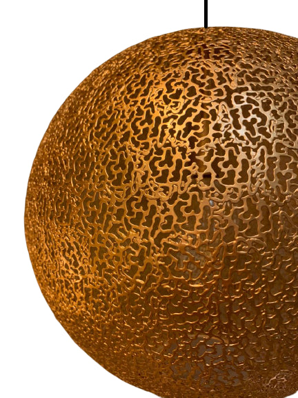 Een echte eye-catcher hoor. De bol is mat goud, met gefreesde, subtiele vormen. Heel sfeervol.