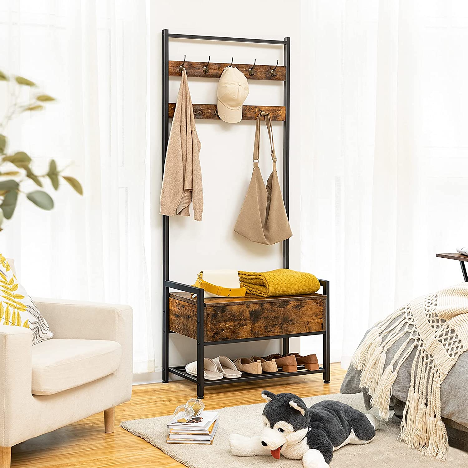 Deze kapstok combineert de functies van een garderobe, een zitbank, een kast en een schoenenrek, hij kan niet alleen kleding ophangen, maar ook schoenen wisselen