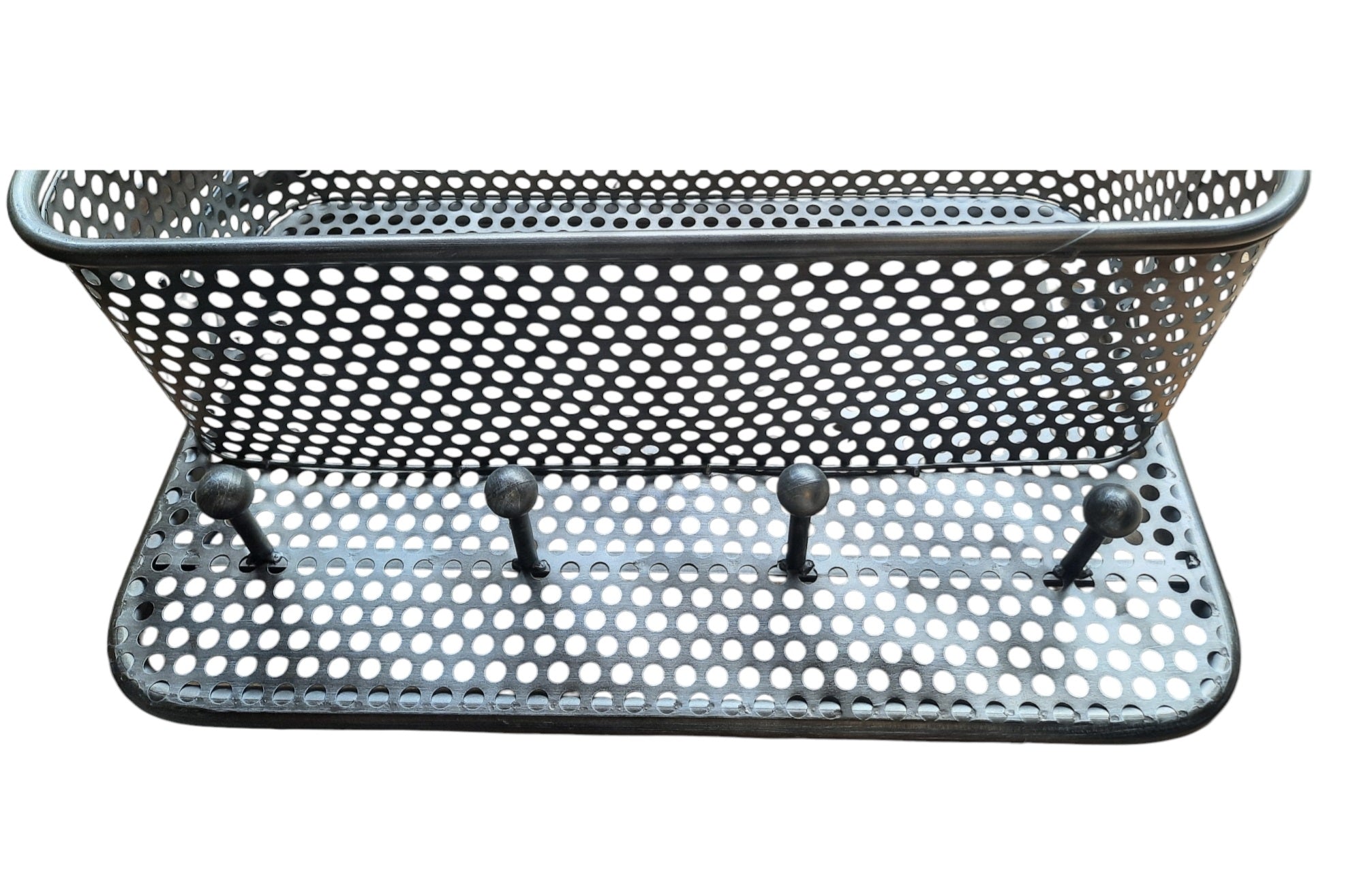 De wandkapstok is gemaakt van metaal en beschikt over een zilvergrijze kleur. De wandkapstok heeft een stoere industriële uitstraling. De wandkapstok beschikt over 4 haken waar jassen en sjaals aan opgehangen kunnen worden. De bovenzijde van de wandkapstok heeft nog een vak waar je bijvoorbeeld mutsen en handschoenen in op kunt bergen. Wat deze wandkapstok bijzonder maakt: • Stevig materiaal • Industriële look • Vak voor mutsen en handschoenen • Makkelijk te bevestigen aan de muur • Stijlvol Specificaties: • Breedte: 57 cm • Diepte: 21 cm • Hoogte: 32 cm • Kleur: Zilvergrijs • Materiaal: Metaal • Merk: By-Boo