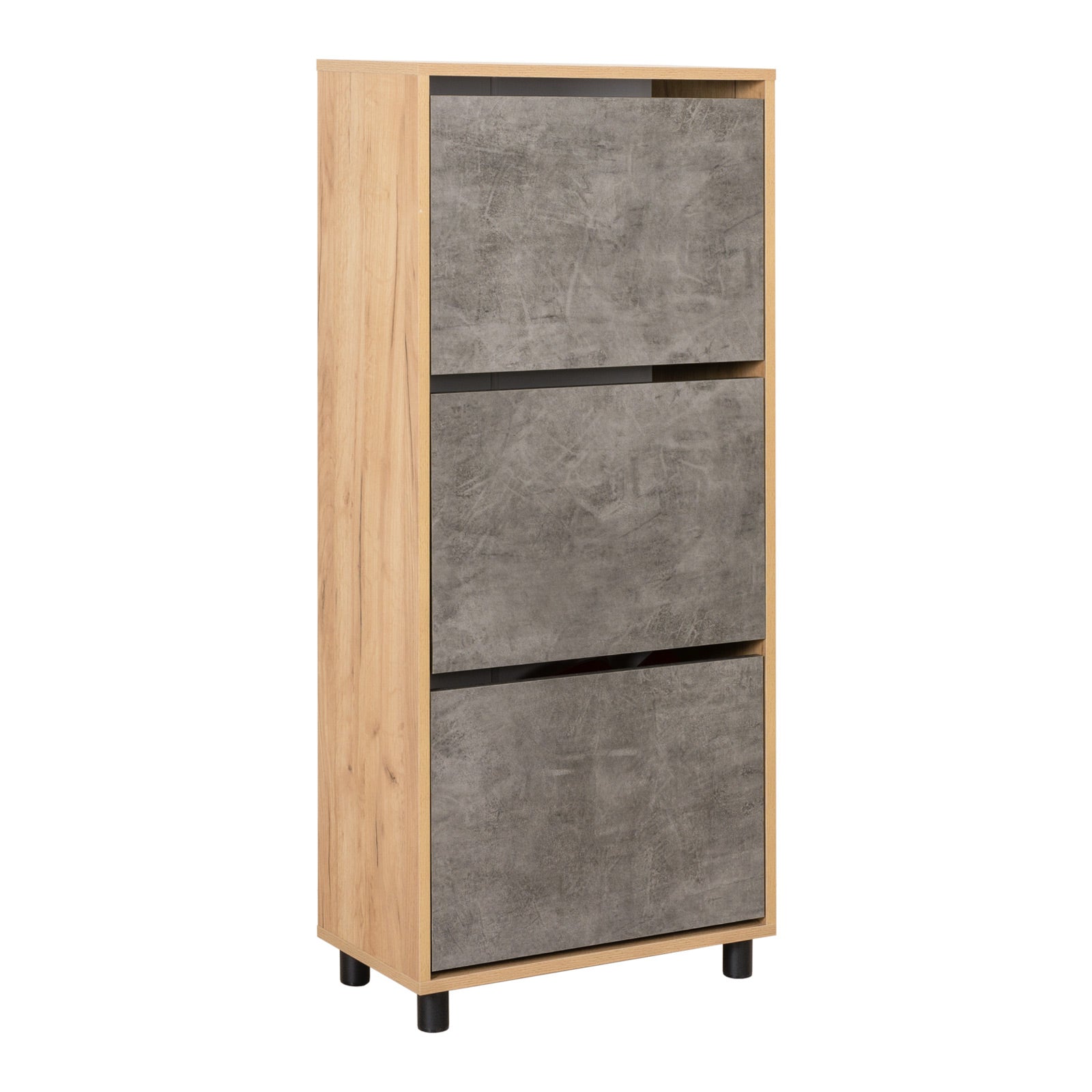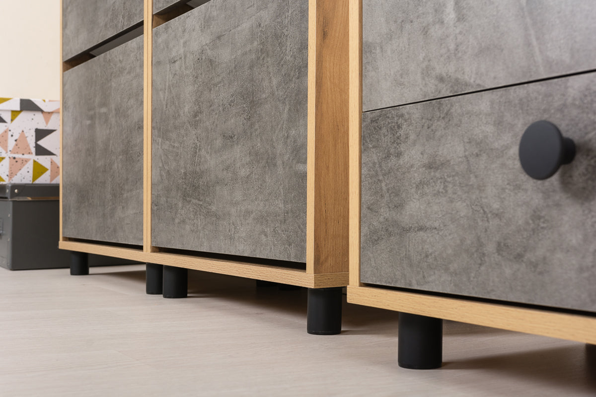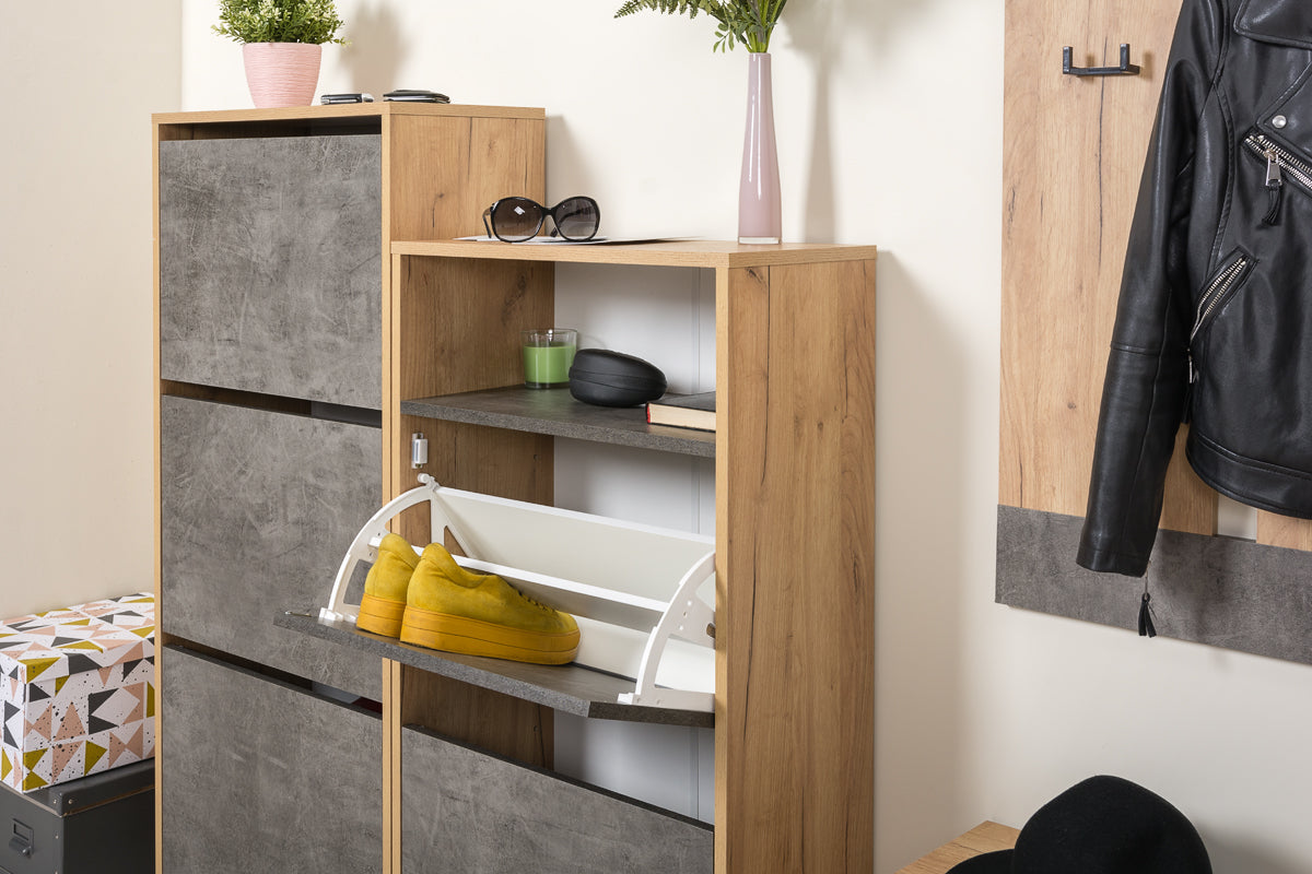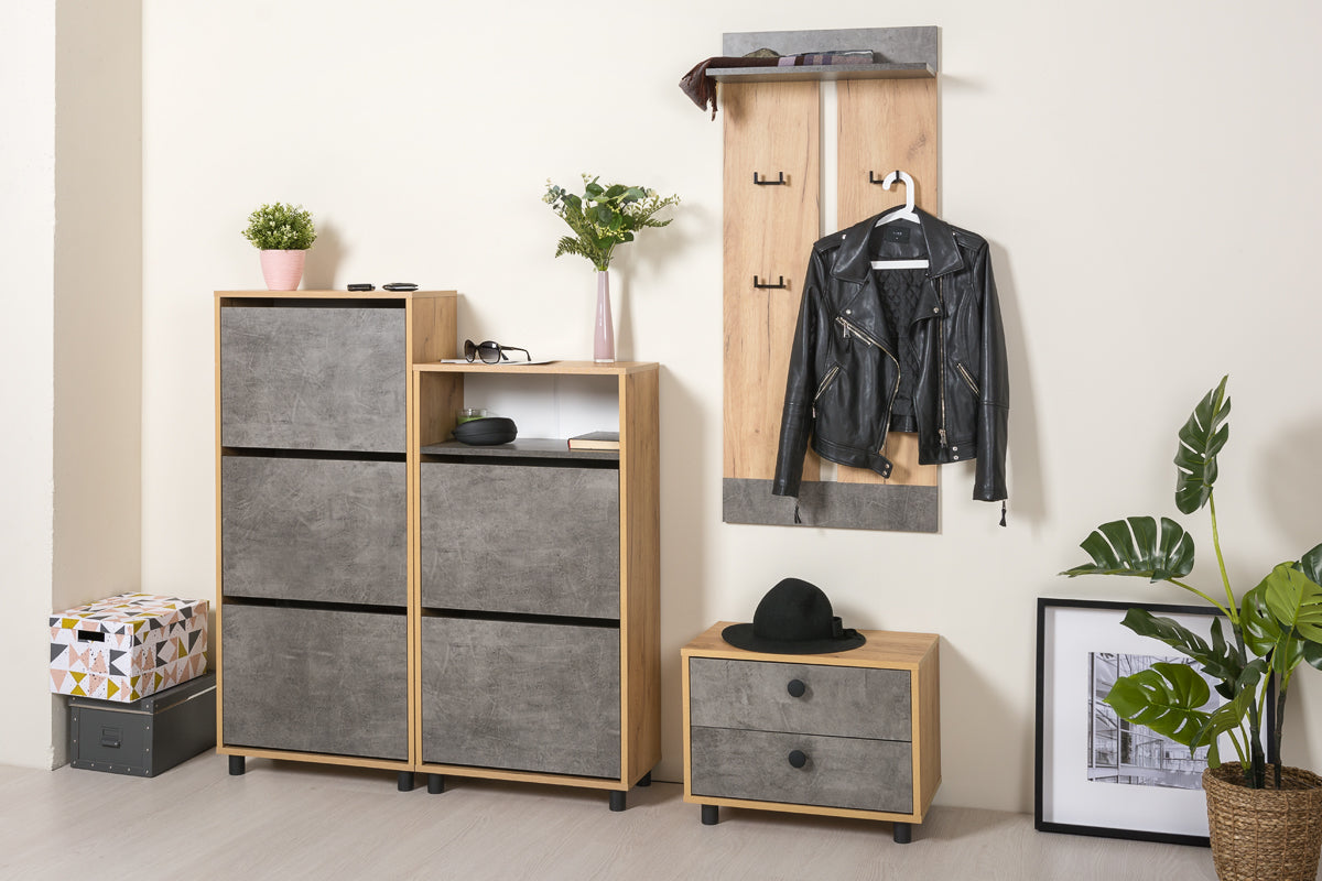Sharons choice eiken grijs is een staand schoenenkast dat past in zowel woonkamers ,hal als slaapkamers. De Sharons choice is voorzien van 3 lades . Sharons choice heeft een MDF constructie afgewerkt in eiken met een grijze versiering in de afwerking van lades en plank De Sharons choice heeft een industriële uitstraling. schoenenkast Sharons choice heeft een breedte van 55x28x124 cm