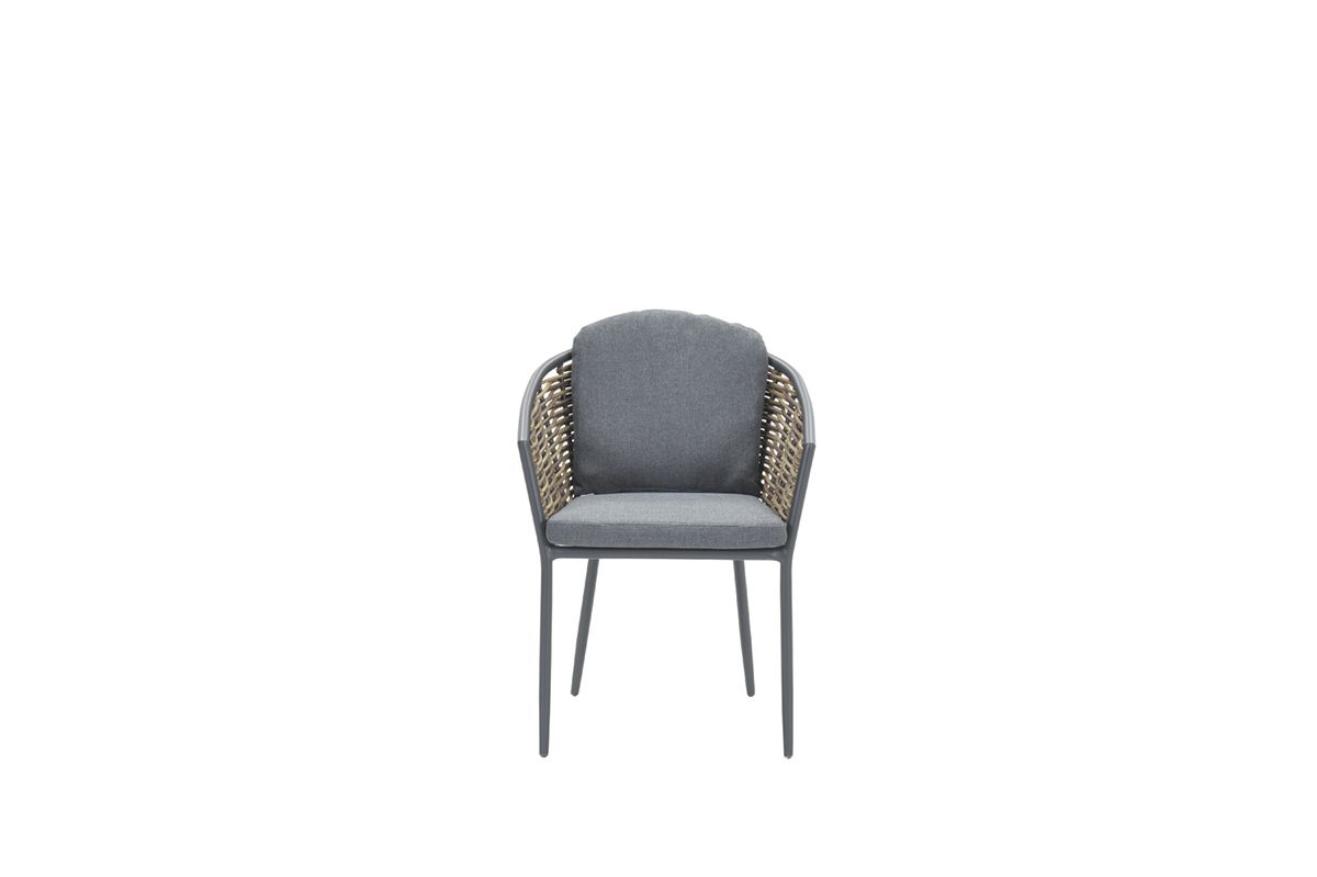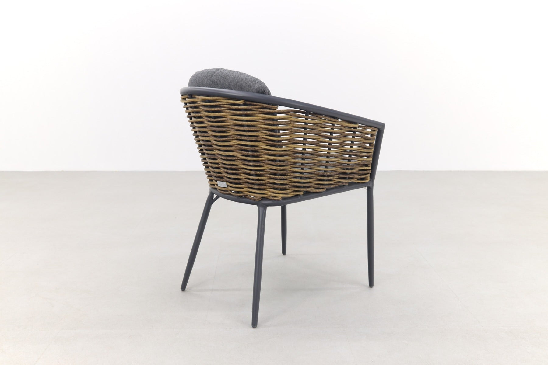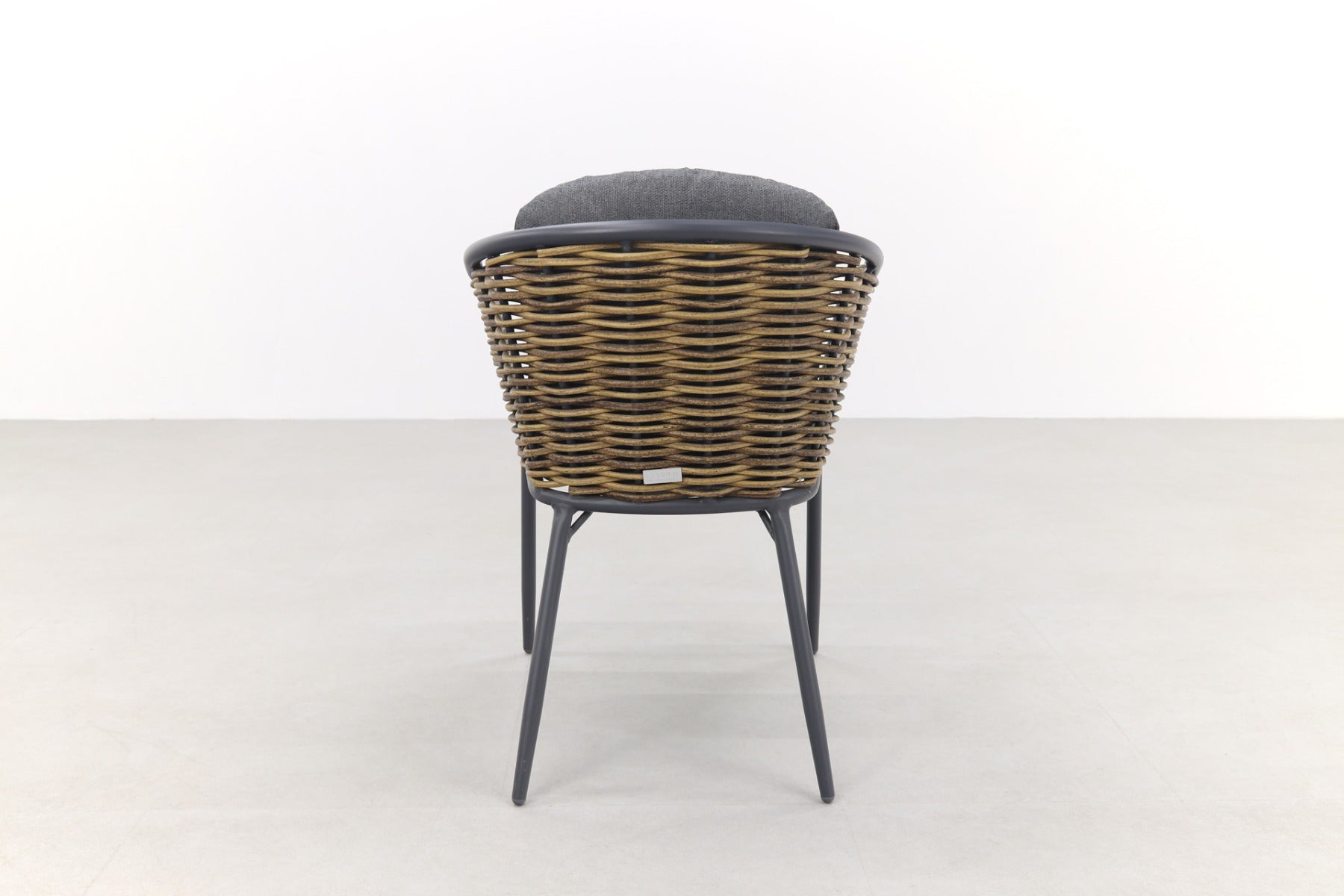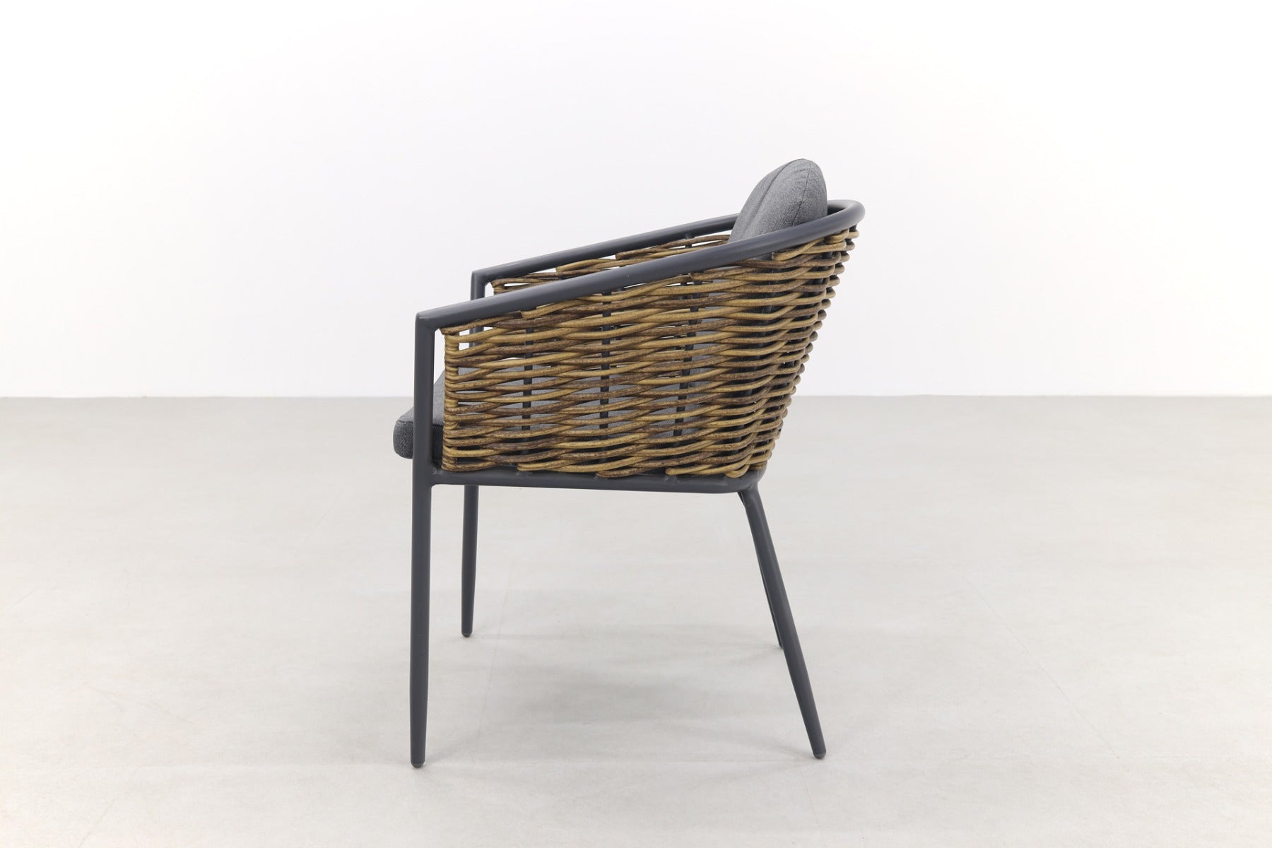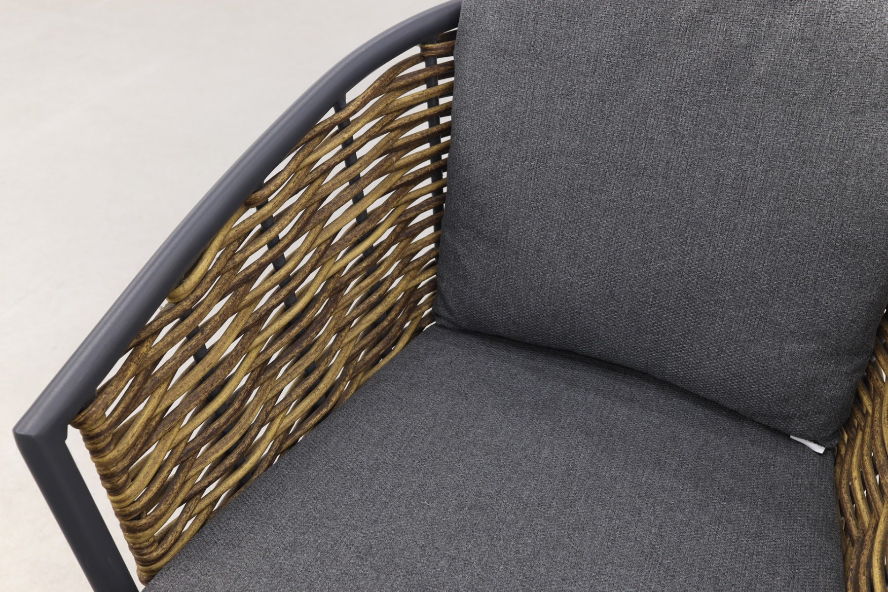 Het frame is gemaakt van gepoedercoat aluminium, met wicker dat voor een natuurlijke rotan-look zorgt. De stoel wordt geleverd inclusief kussens, die een waterafstotende coating hebben.