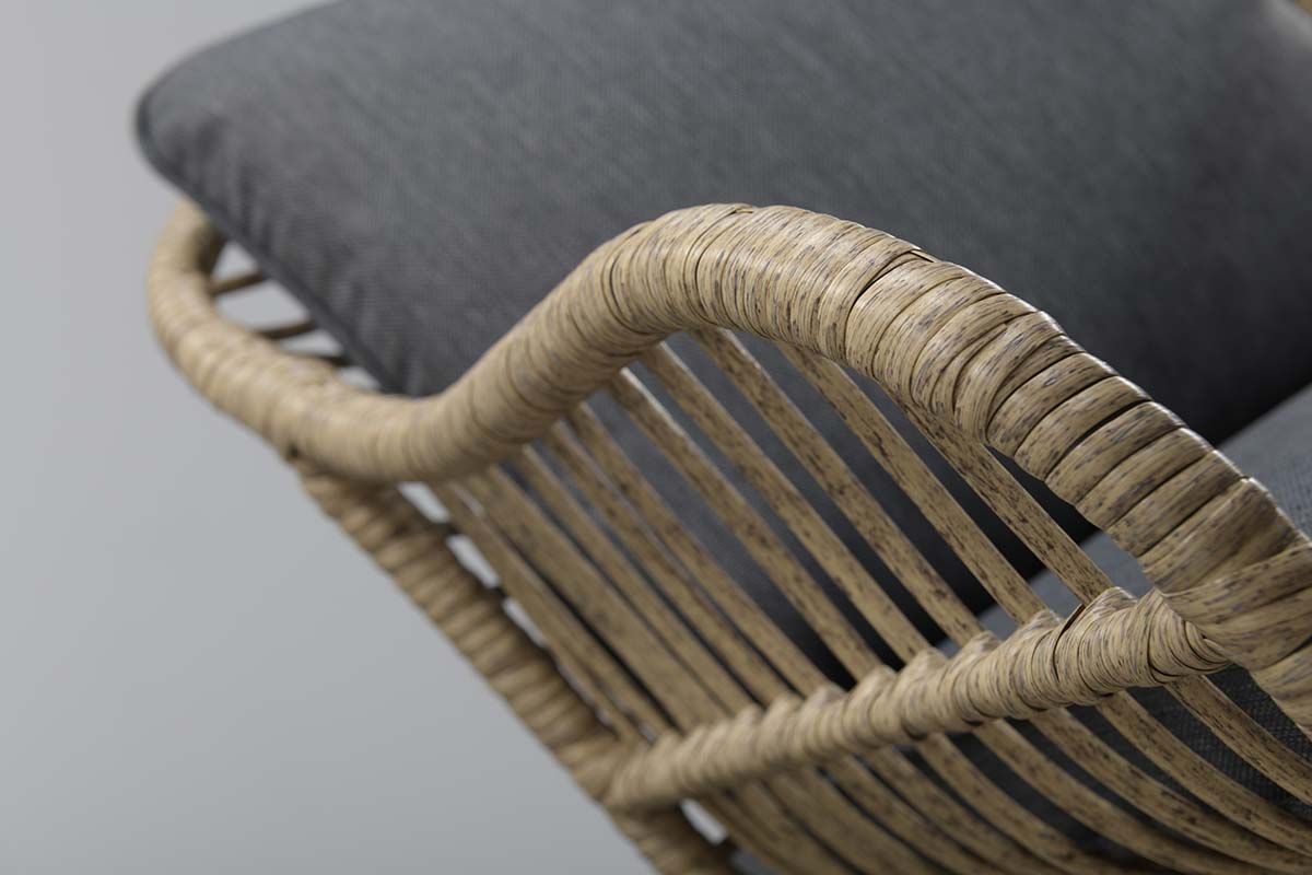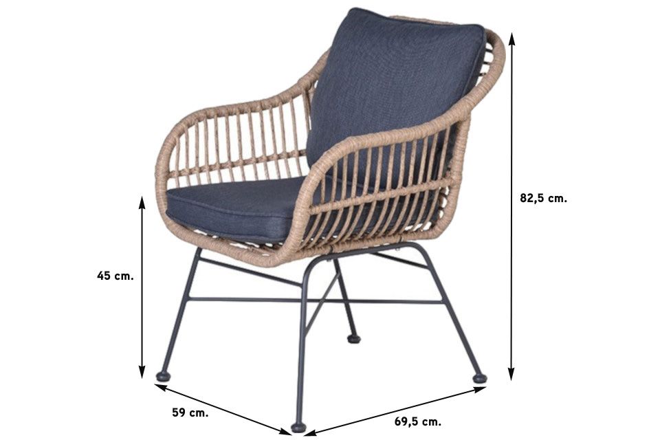 De Garden Impressions Margriet dining tuinstoel is nieuw in de collectie bij Van der Garde Tuinmeubelen. De tuinstoel kenmerkt zich door zijn unieke design. De stoel heeft een rotan of ratan look. Het rotan is gemaakt van kunststof wat ervoor zorgt dat de stoel een extra lange levensduur heeft. De Margriet tuinstoel heeft een stalen frame dat een powder coated behandeling heeft gehad. De kleur van de poten is antraciet en de kuip heeft een naturel kleur. De stoel wordt geleverd inclusief bijhorend zit- en rugkussen.