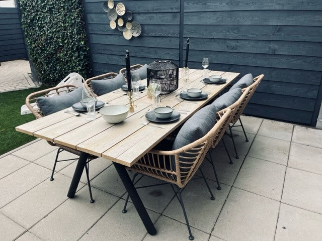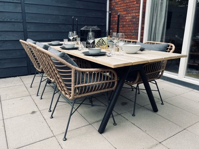 Op zoek naar een tuinset die dient als blikvanger? Dan is de Margriet tuinstoel met Nevada rechthoekige tuintafel een echte aanrader. De Margriet tuinstoel heeft een uniek design met de rotan look. Een retro uitstraling met gebruik van moderne materialen! De Nevada tuintafel heeft een polywood tafelblad met een stevig aluminium frame. Mochten 6 zit plaatsen onvoldoende blijken, kan je aan de kopse kanten altijd nog een stoel bijschuiven! De tuinset is eenvoudig online te bestellen en wordt gratis thuis bezorgd. Liever eerst even proef zitten? Breng dan een bezoek aan onze showroom in Opheusden, Duiven of Apeldoorn. Je bent van harte welkom!
