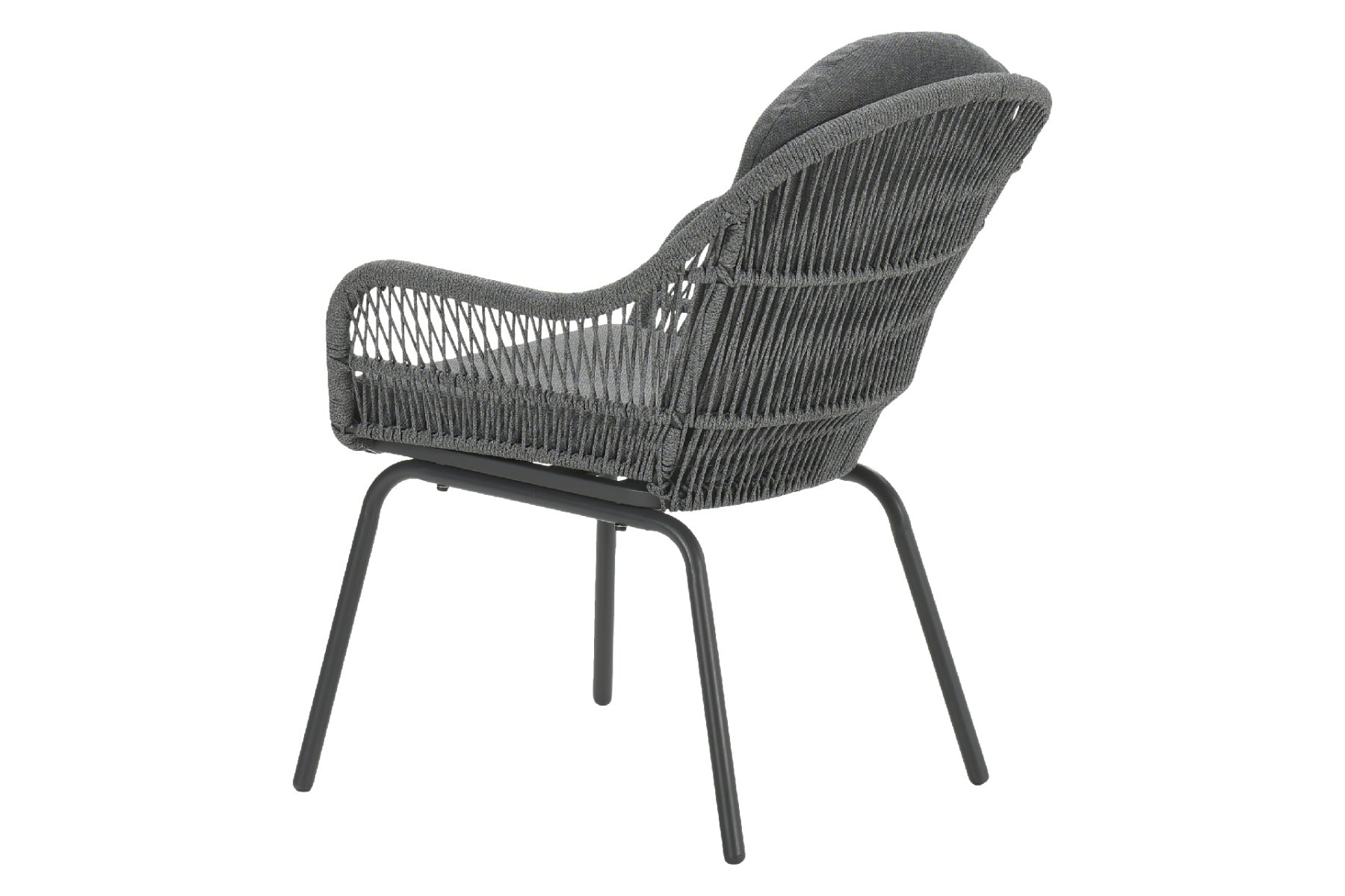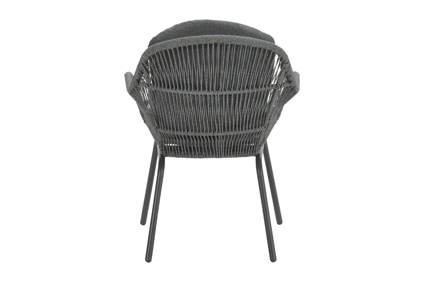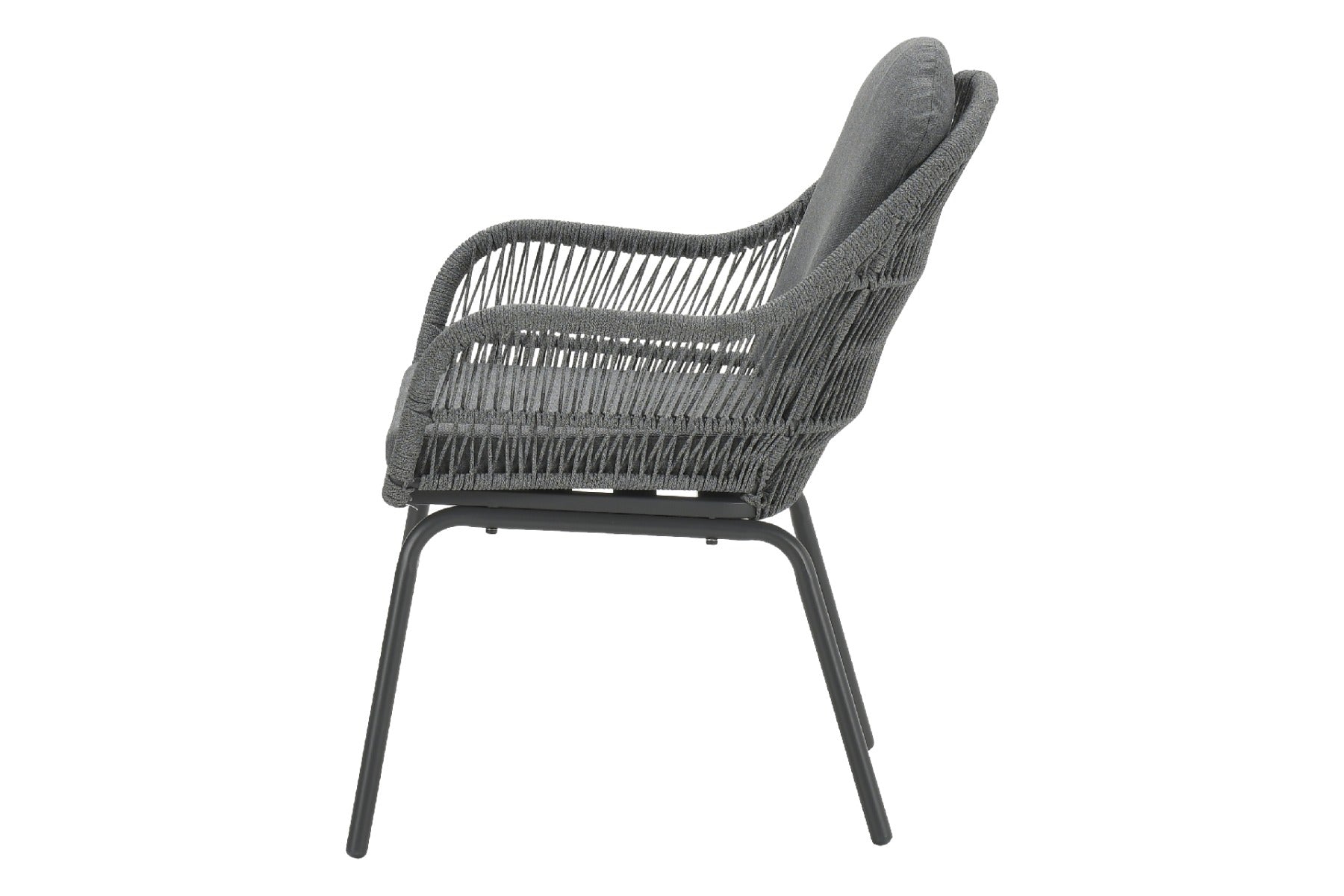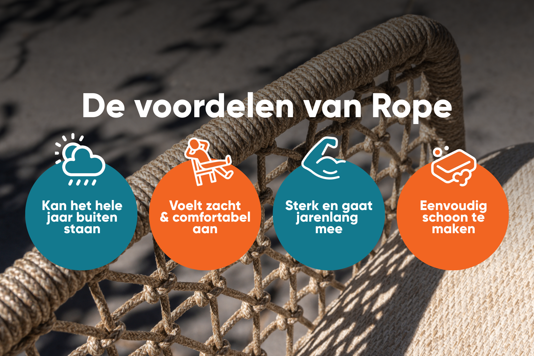 Deze stoel heeft een aluminium frame, waarop een beschermende poedercoating is aangebracht. In de rug en armleuningen zit Qualicord-rope. Dit is 5 mm. dik hoogwaardige kwaliteit licht grijs gekleurd touw. Dit touw is te vergelijken met touw dat in de scheepsvaart wordt gebruikt. Het touw is voorzien van een rubberen kern binnenin met daarin meerdere polyester draden voor de stevigheid. Om de rubberen kern zit solution dyed polyster. Dit houdt in dat het touw door en door gekleurd is en hierdoor veel minder snel van kleur zag vervagen. De kussens zijn voorzien van een rits waardoor de hoezen gemakkelijk met de hand gewassen kunnen worden. Wij raden aan om de kussens na gebruik op te bergen in de schuur of een opbergbox. De rug- en zitkussens hebben een waterafstotende coating. Hierdoor veeg je vocht er heel gemakkelijk weer vanaf. Wanneer de stoel bij jou thuis geleverd wordt dient alleen het onderstel nog gemonteerd te worden aan de bovenkant. Daarna kun je volop gaan genieten van deze prachtige stoelen.