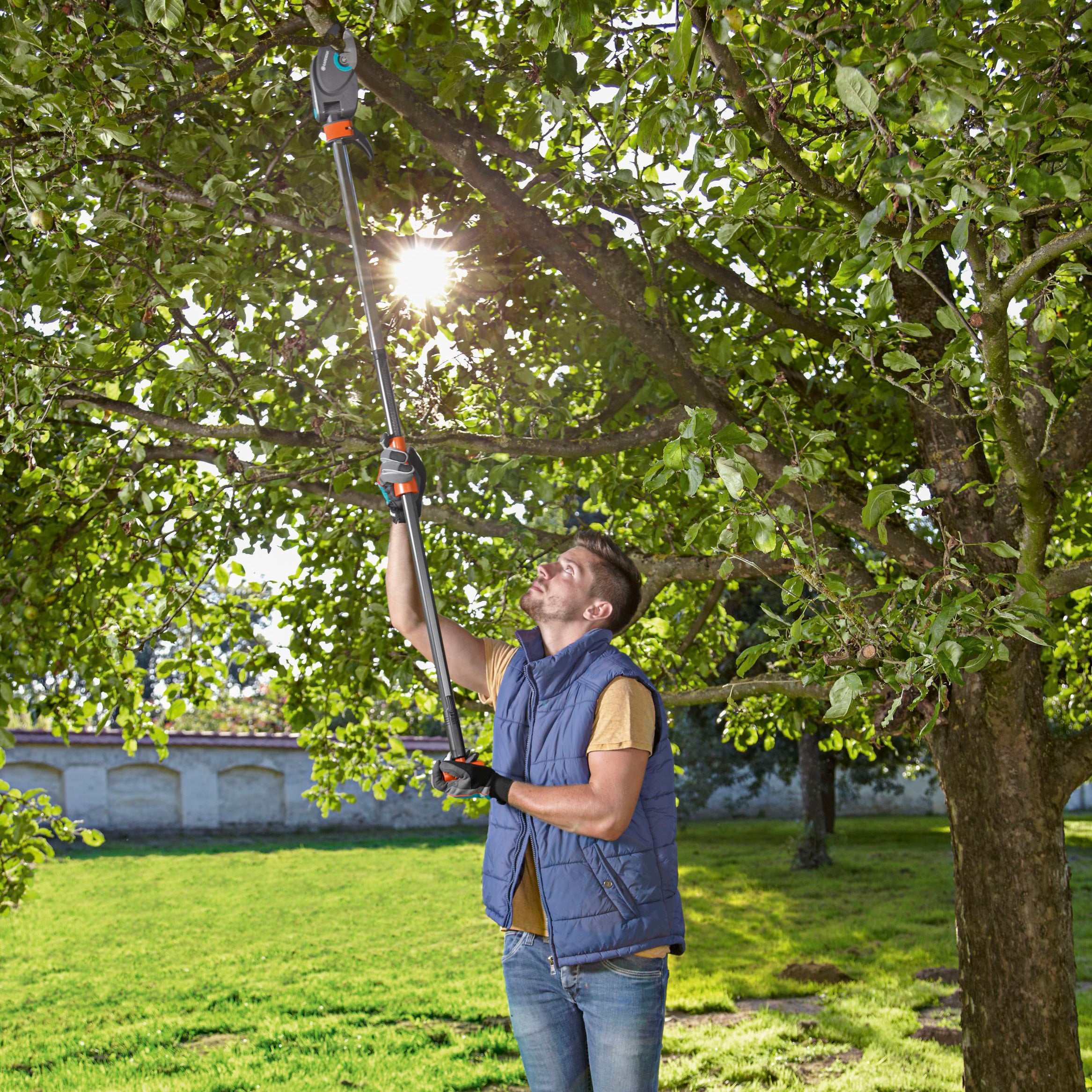 Veilig takken knippen Je werkt veilig vanaf de grond op grote hoogte met deze takkenschaar van Gardena. Door zijn lengte van 160 cm kan je gemakkelijk en veilig de takken in de boom knippen. De schaar is uitgerust met een handige en verstelbare haak die afgesneden takken eenvoudig verwijdert. Het interne mechanisme voorkomt dat takken vast komen te zitten tijdens het knippen. De messen zijn met precisie geslepen en uitgerust met antikleefcoating zodat je zelfs door dikkere takken gaat. Een ideaal stuk tuingereedschap!