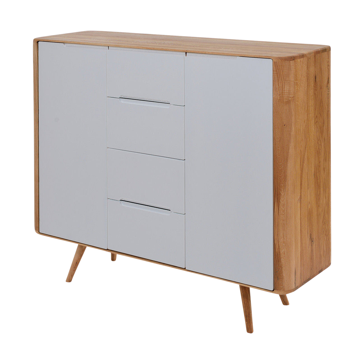 Door de combinatie van het eikenhout met de witte lades, krijgt deze opbergkast een retro jaren ’50 look. De Ena Dresser Two is een massief eikenhouten opbergkast met vier lades en twee deurtjes. Achter de deurtjes zitten aan beide kanten twee planken. Deze witte lades en deurtjes hebben het soft-close systeem. Dit zorgt ervoor dat de lades en deurtjes geleidelijk sluiten. Door de vele opbergruimtes, geruisloze lades en perfecte hoogte van 110 cm is deze kast tevens te gebruiken als commode.