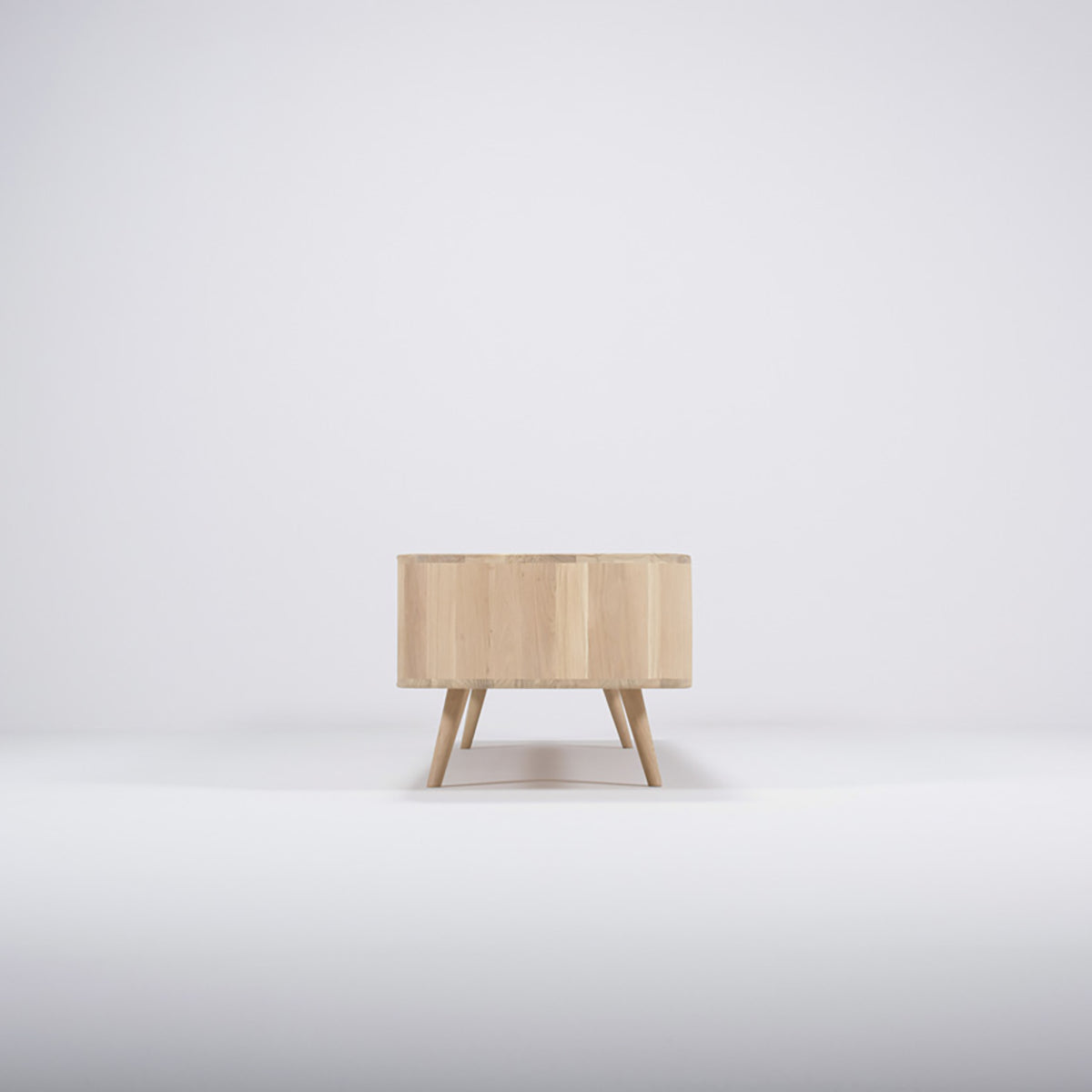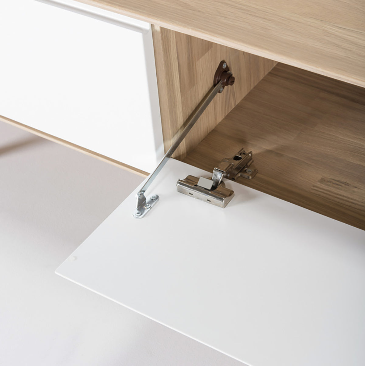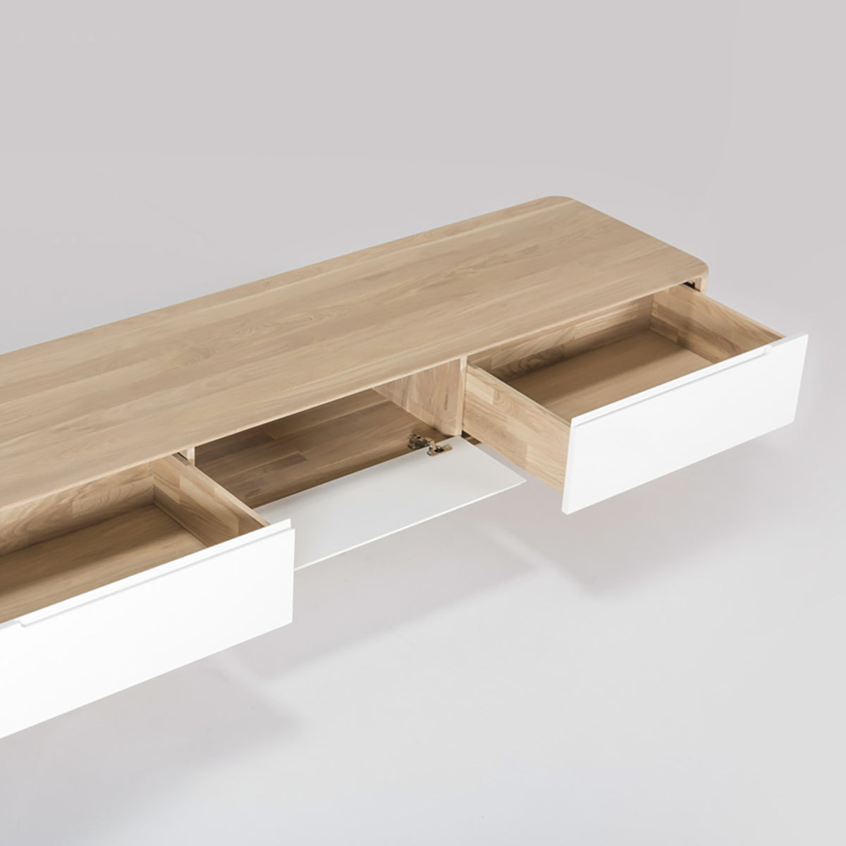 De afgeronde hoeken en de witte lades zijn geinspireerd op de jaren 50 en zorgen voor een retro-moderne sfeer in jouw woonkamer. Het massief eikenhouten TV meubel heeft drie vakken. De buitenste vakken hebben lades en het middelste vak heeft een klep. Aan de achterzijde van het TV meubel zit een uitsparing voor de kabeldoorvoer. Dit maakt het TV meubel niet alleen mooi, maar ook heel functioneel.