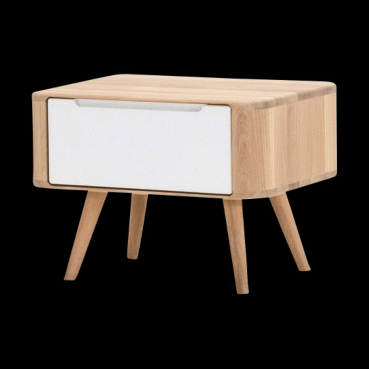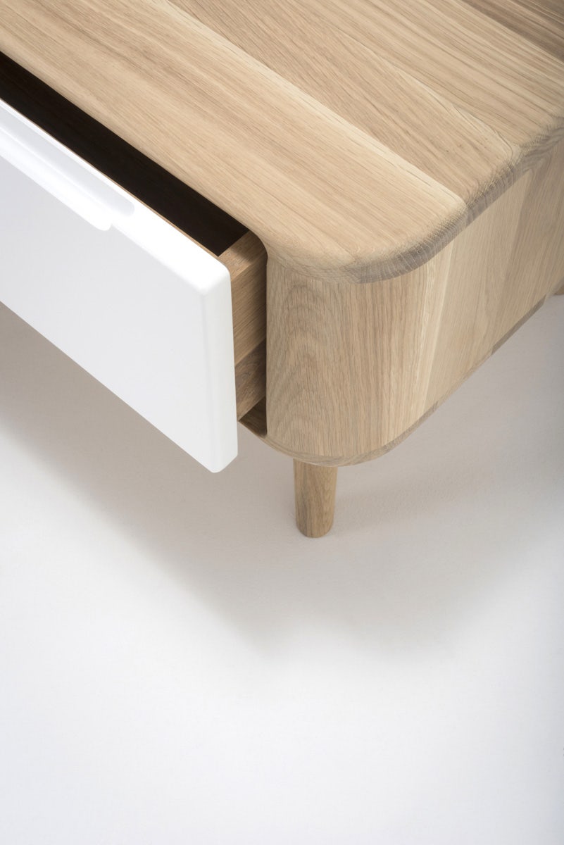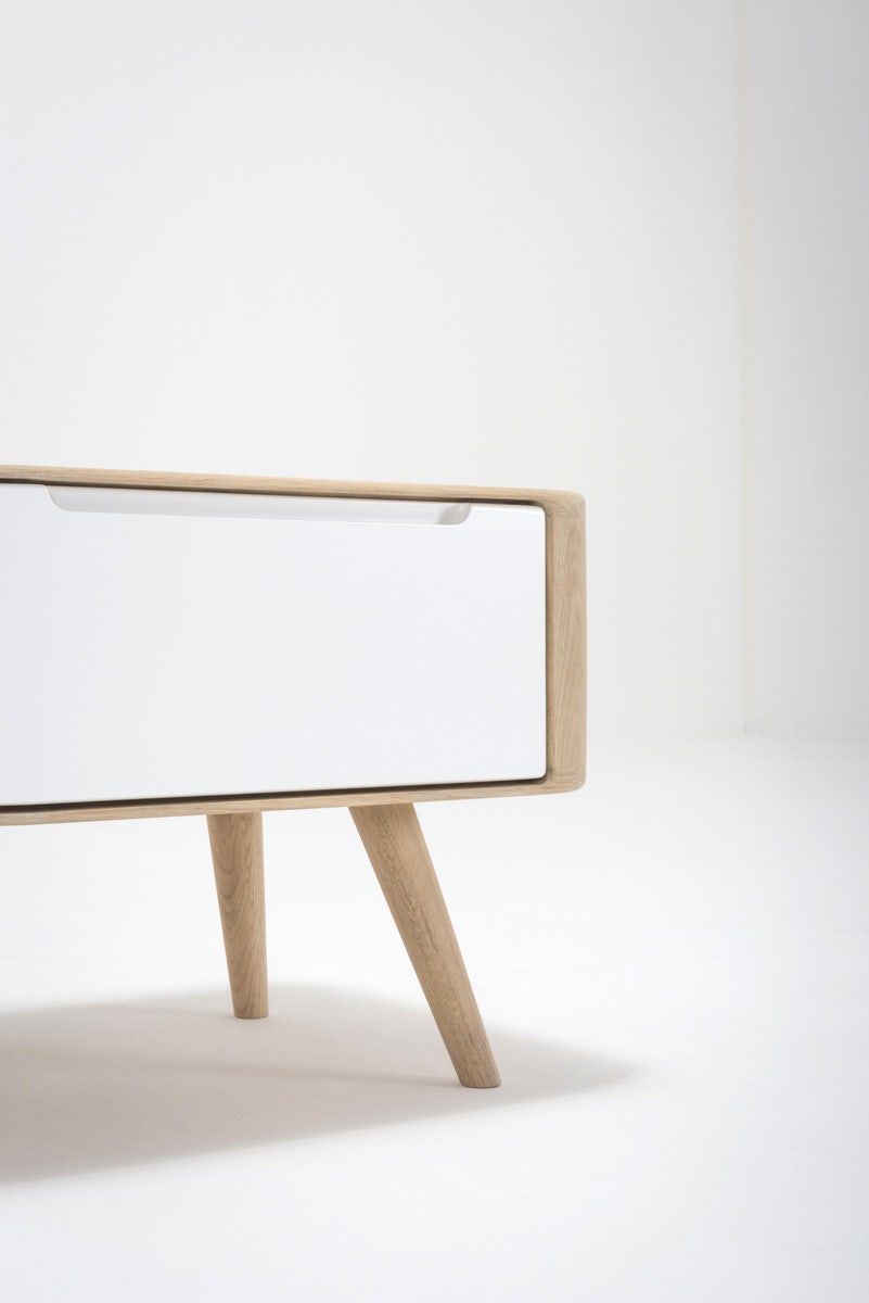 Door de combinatie van het eikenhout met de witte lade, krijgt het nachtkastje een retro jaren ’50 look. De Ena Nightstand Two is een massief eikenhouten nachtkastje met één lade. Deze witte lade heeft het soft-close systeem. Dit zorgt ervoor dat de lade geleidelijk sluit. Ook zorgt dit ervoor dat de lade geruisloos sluit - handig voor in de slaapkamer!