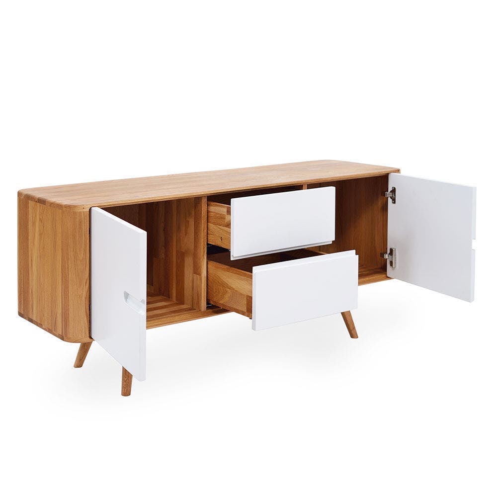 De witte lades en deurtjes zorgen voor het moderne contrast in dit massief eikenhouten meubel. Het Ena Sideboard heeft twee lades en twee deurtjes, allemaal met het soft-close systeem. Dit zorgt ervoor dat de lades en kastjes geleidelijk sluiten. Hierdoor is er genoeg opbergruimte voor je spullen. Door het massieve eikenhout is het sideboard een echt Scandinavisch dressoir.