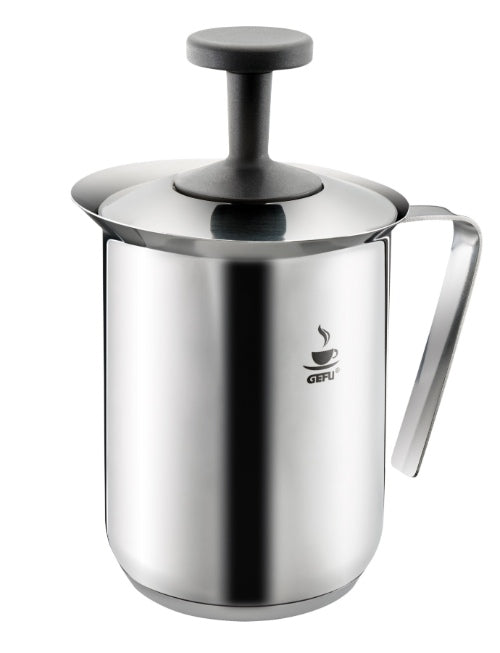 Met de Riccardo melkopschuimer van Gefu maak je in no-time romig melkschuim voor cappuccino, latte macchiato en meer. Dankzij de dubbele zeef wordt de effectiviteit verhoogt zodat het opschuimen twee keer zo snel gaat. De opschuimer is voorzien van een sandwich bodem wat hem geschikt maakt voor gas, keramische, elektrische en inductie kookplaten. Verder is hij voorzien van een comfortabel handvat waardoor hij makkelijk in gebruik is. De melkopschuimer heeft een inhoud van 800 ml met een maximaal vulvolume van 300 ml en kan na gebruik in de vaatwasser.