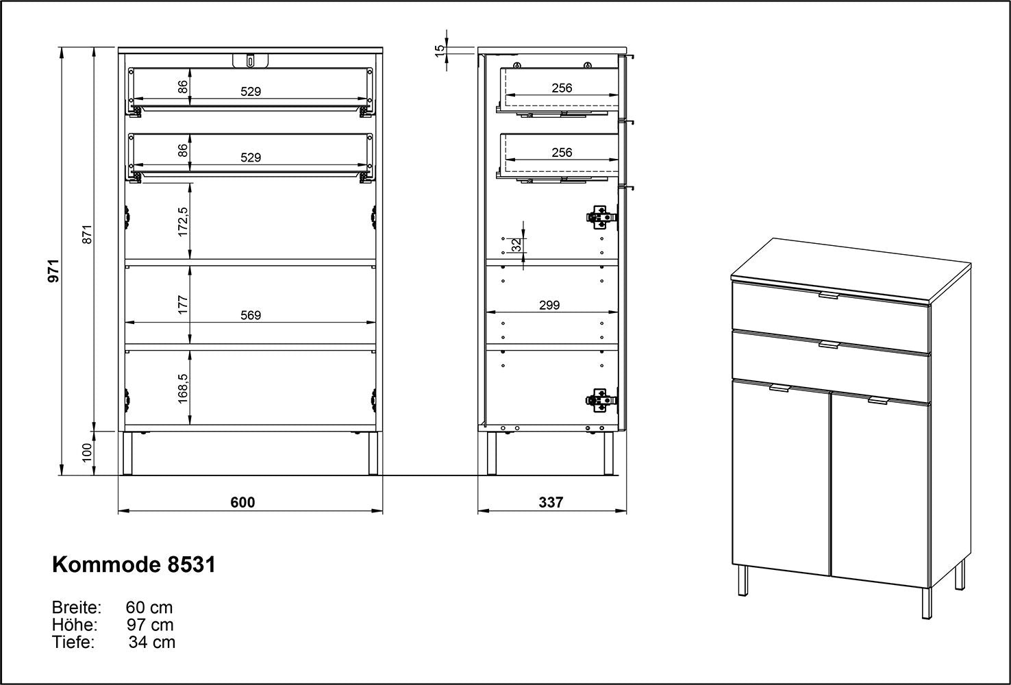 - Afmetingen: 60 x 34 x 97 cm (B x D x H)