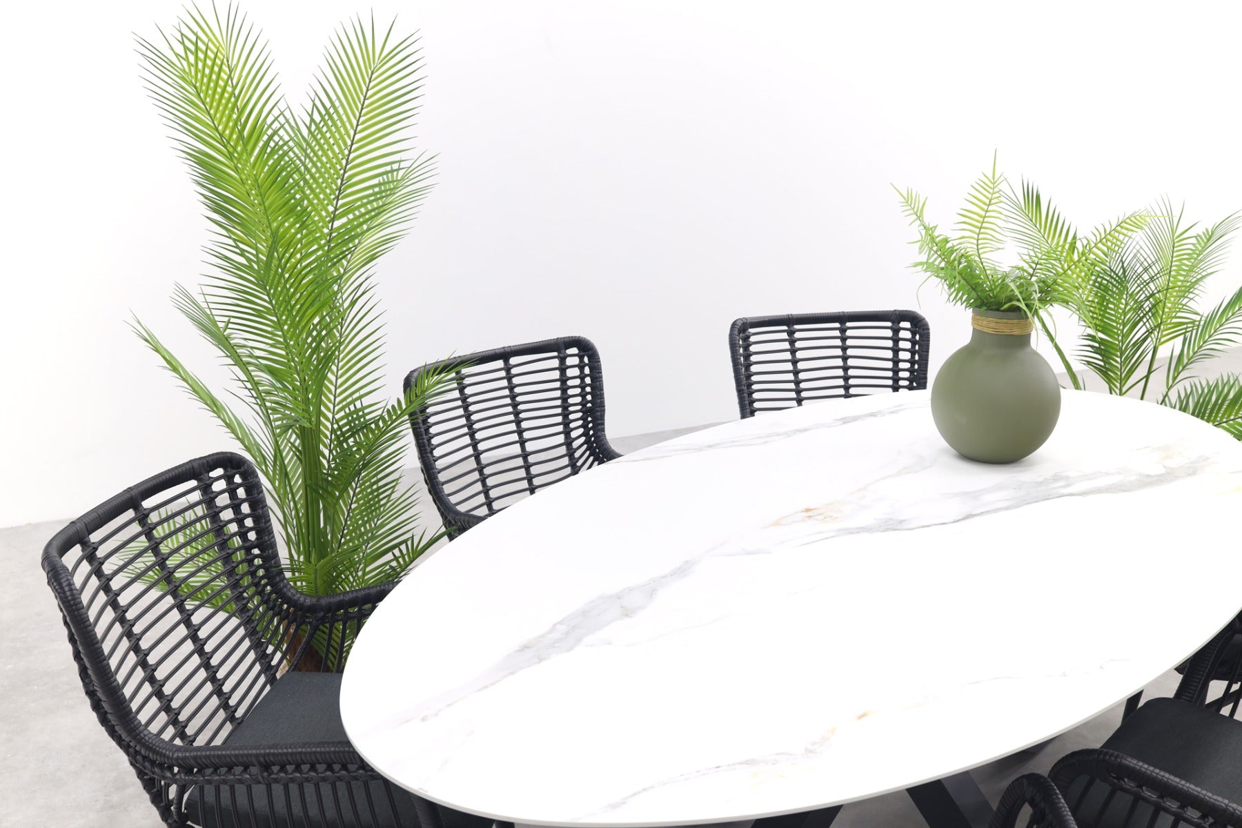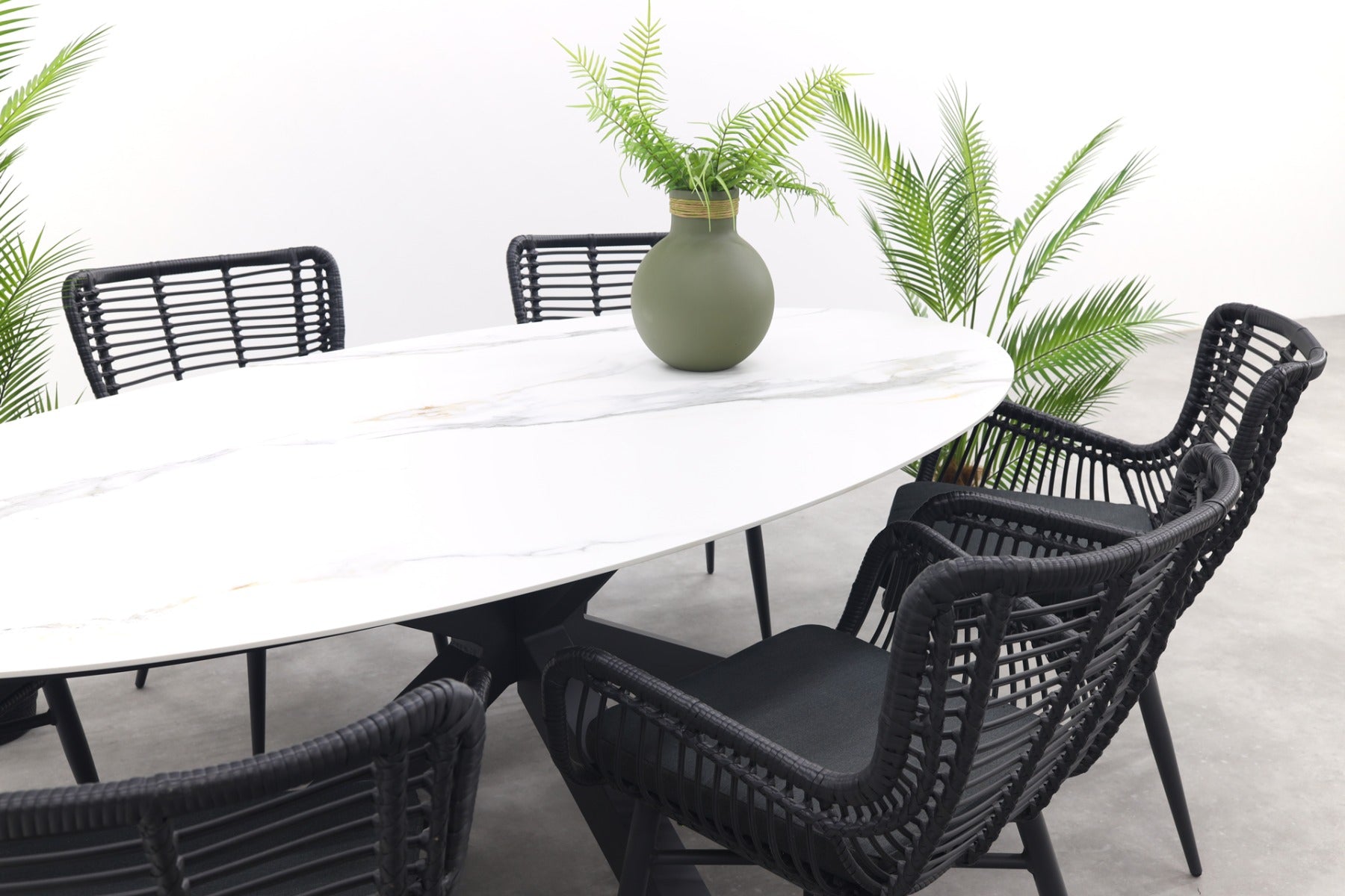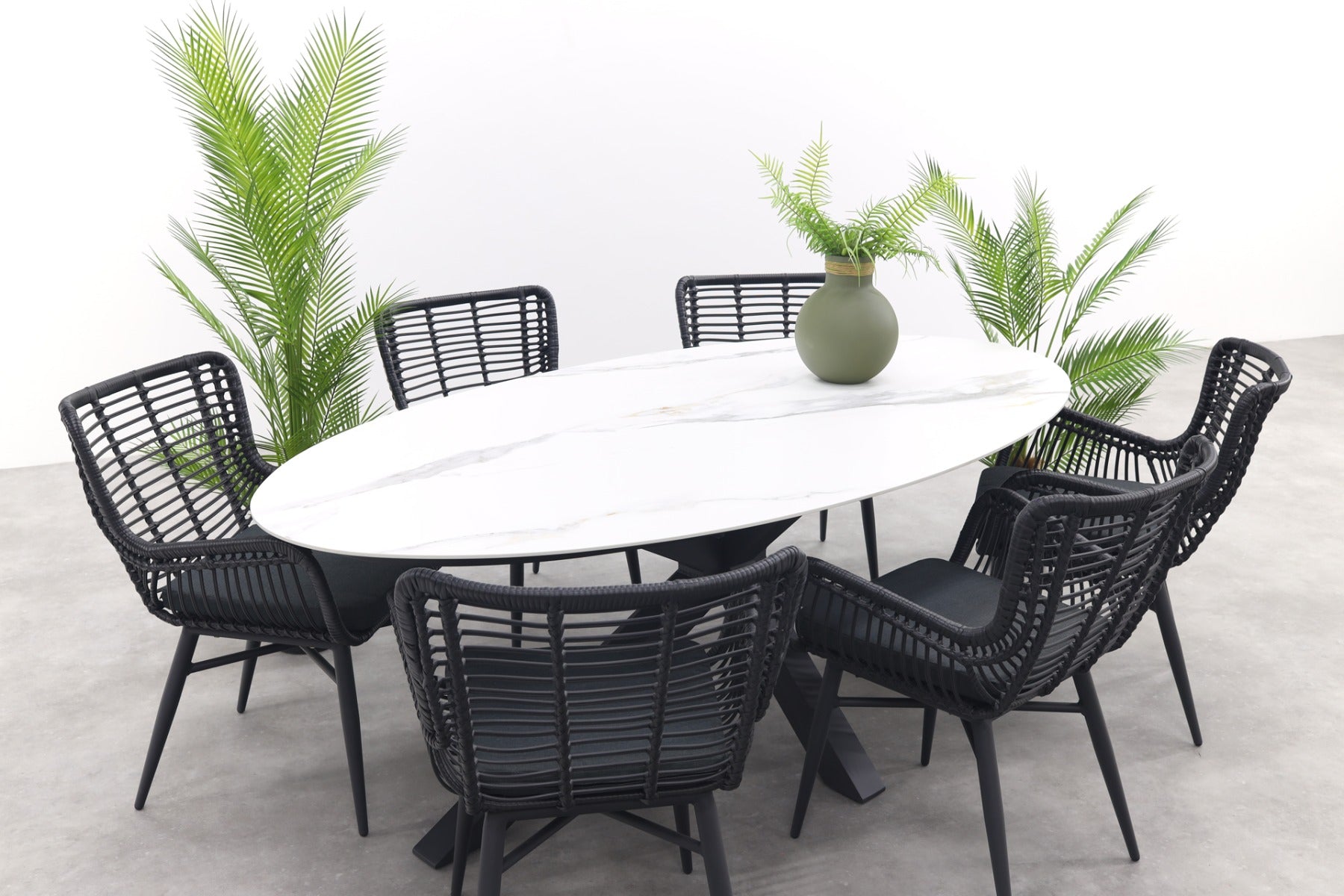 6x tuinstoel Jasmine Black 1x Scotland ovale tuintafel 220x115 cm.- marmerlook wit