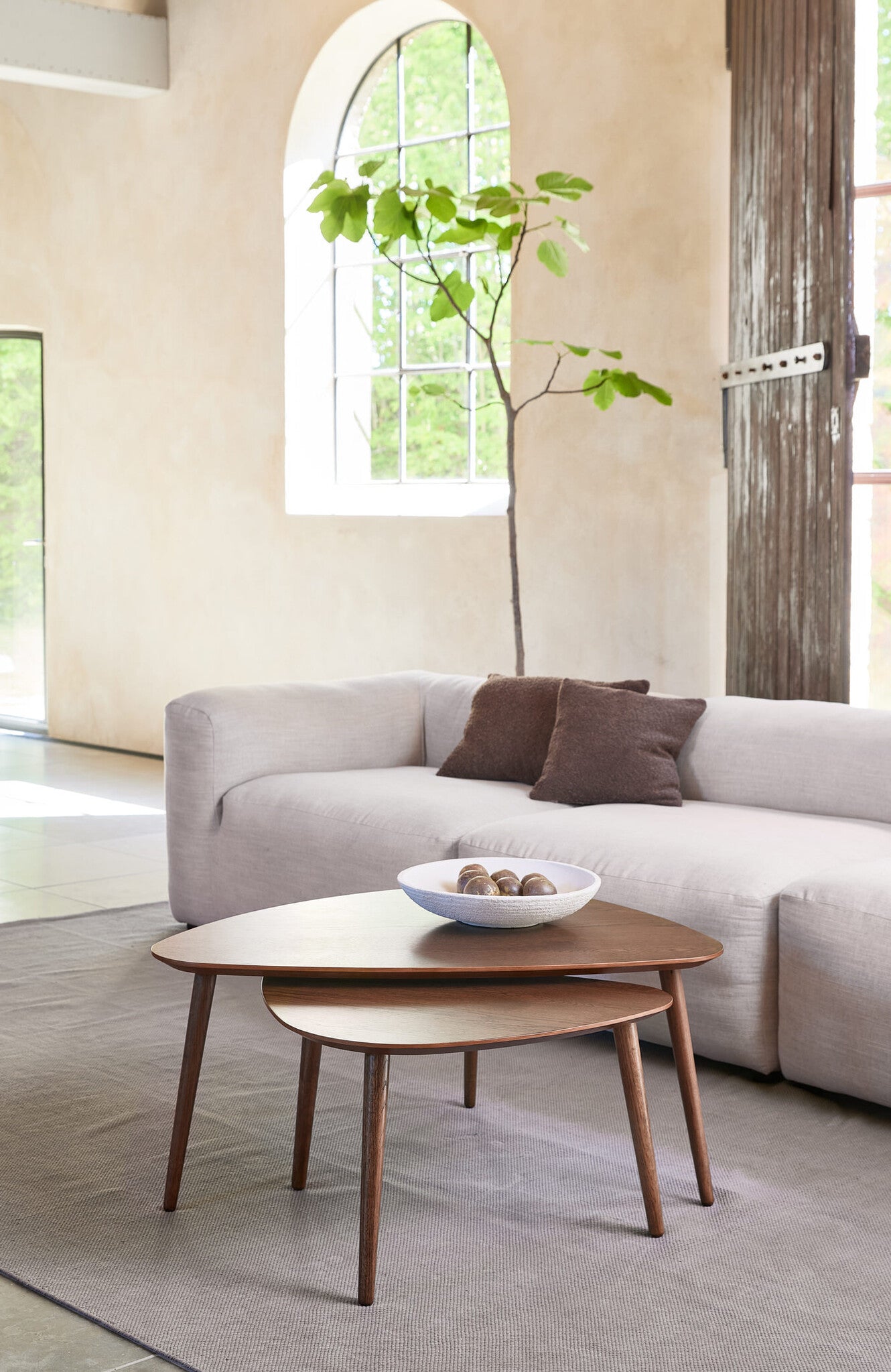 - Salontafel Adda is een driehoekvormige salontafel gemaakt van eikenhout.