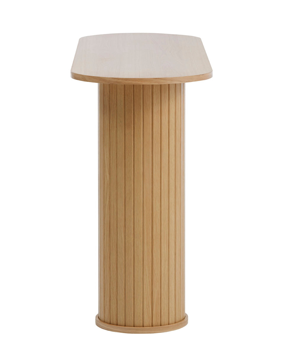 Materiaal: De Sidetable Nola is volledig gemaakt van eikenhout, zowel het tafelblad als het onderstel. Eikenhout staat bekend om zijn robuustheid en lange levensduur, waardoor het een uitstekende keuze is voor meubels die tegen een stootje moeten kunnen. Het natuurlijke karakter van het hout zorgt voor een warme uitstraling.