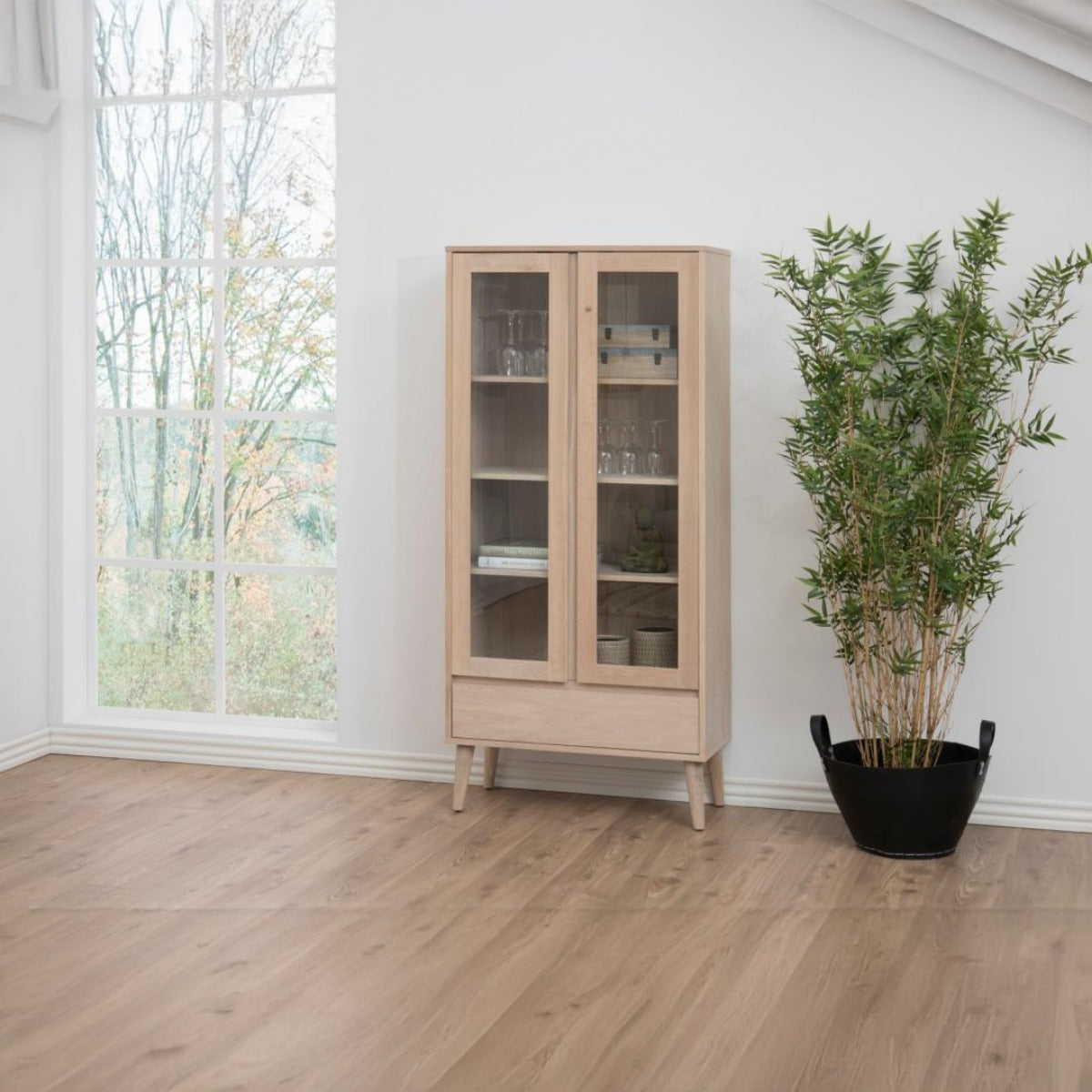 Materiaal: De Vitrinekast Rosta is vervaardigd uit eikenhout en eiken fineer, wat zorgt voor een robuuste en duurzame constructie. Eikenhout staat bekend om zijn sterkte en tijdloze uitstraling, waardoor het een uitstekende keuze is voor meubels die lang mee moeten gaan.