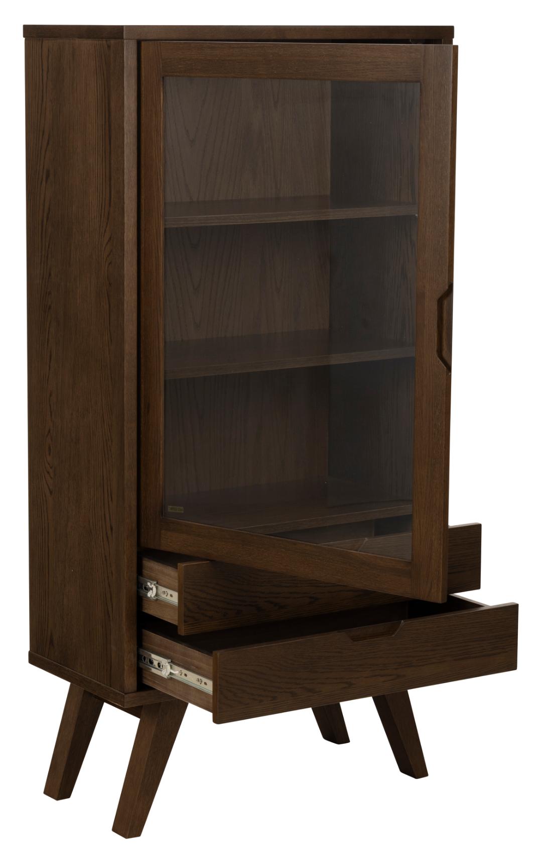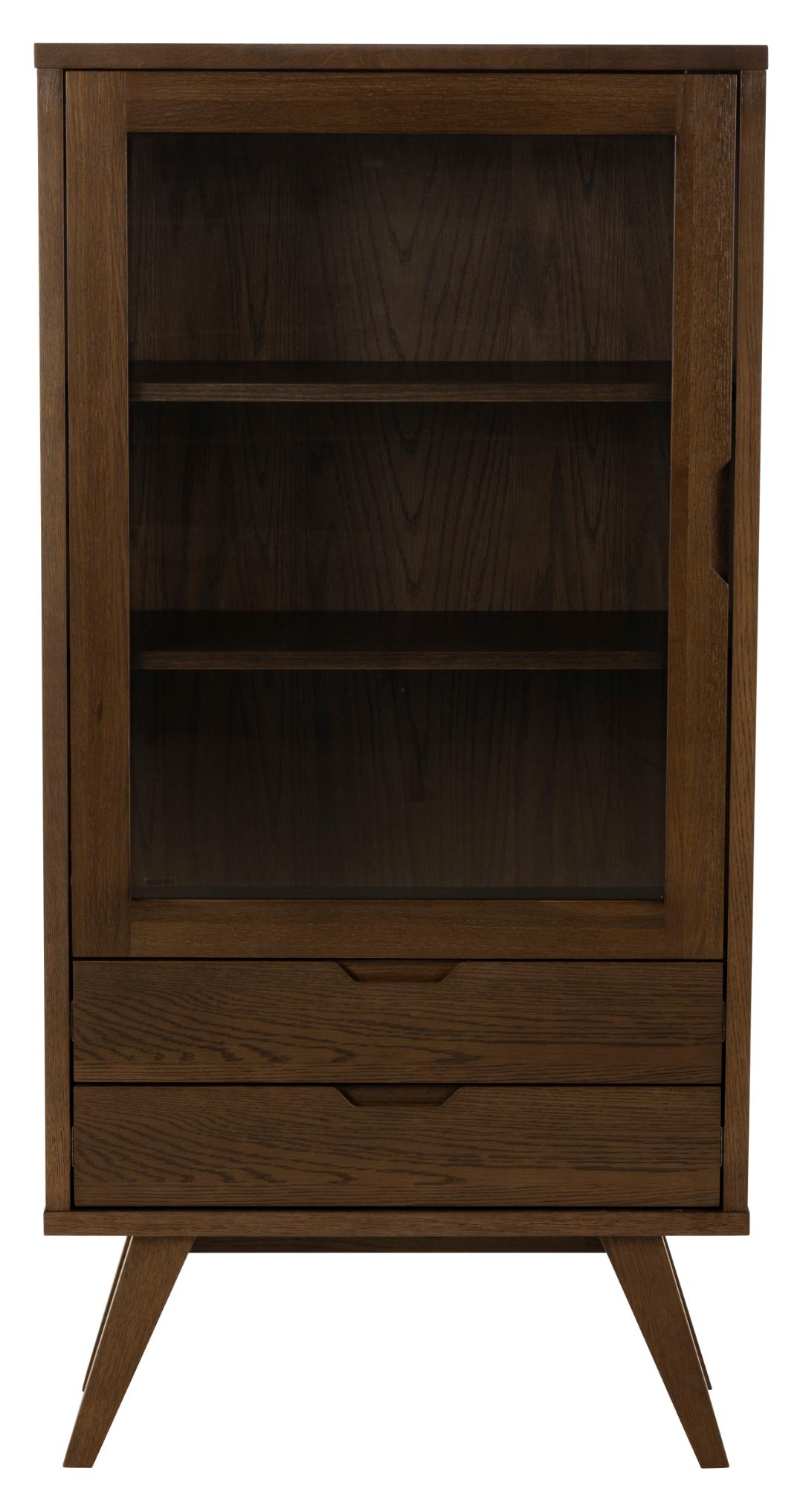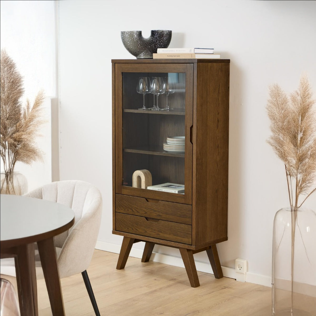 Materiaal: De Vitrinekast Annie is vervaardigd uit glas en eiken fineer. Het gebruik van eiken fineer geeft de kast een natuurlijke en warme uitstraling, terwijl het glas zorgt voor een moderne en luchtige touch. Deze combinatie van materialen maakt de kast zowel duurzaam als stijlvol.