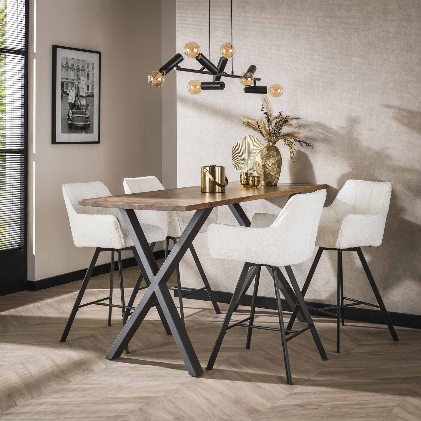 Materiaal: De zitting van de barstoel is gemaakt van hoogwaardig bouclé, wat zorgt voor een zachte en comfortabele zitervaring. Het onderstel is vervaardigd uit stevig metaal, wat bijdraagt aan de duurzaamheid en stabiliteit van de stoel.