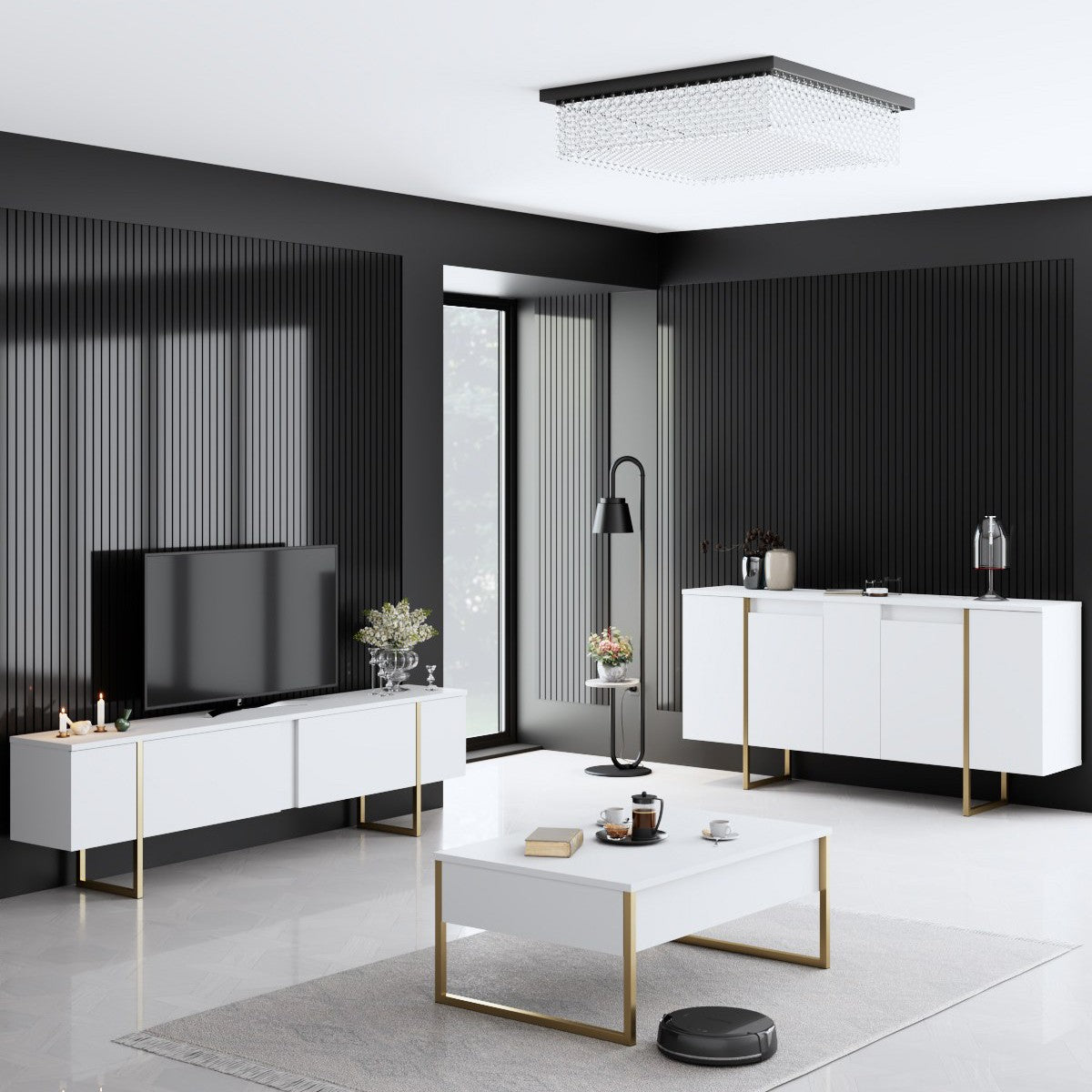 Ontdek het Dressoir Luxe in een elegante combinatie van wit en goud, perfect voor een Hotel Chique interieur. Dit dressoir is vervaardigd uit hoogwaardig metaal en melamine, wat zorgt voor een moderne uitstraling en duurzaamheid. De strakke lijnen en de subtiele gouden accenten maken dit meubelstuk een echte eyecatcher in je woonkamer of hal. Het dressoir biedt niet alleen stijl, maar ook functionaliteit, met voldoende opbergruimte voor al je essentials. Laat je inspireren door de verfijnde afwerking en de tijdloze charme van dit prachtige meubelstuk.