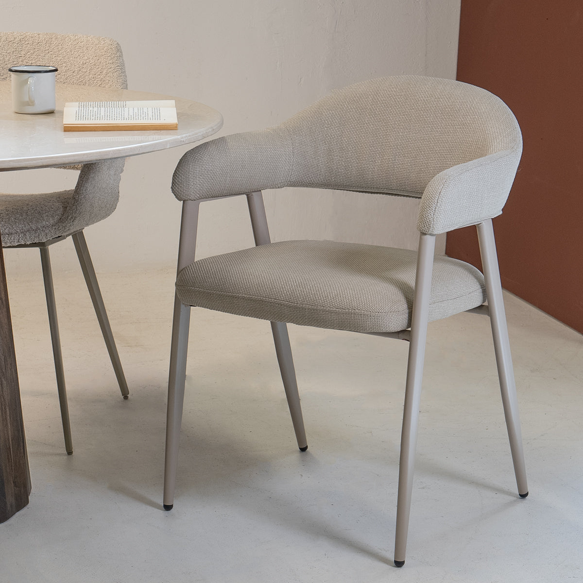 Maak kennis met de moderne Eetkamerstoel Linde Beige van Giga Meubel, een perfecte aanvulling op elke eetkamer die stijl en comfort hoog in het vaandel heeft staan. Deze stoel combineert een stijlvol modern design met het comfort van stof en de stabiliteit van metaal. De beige kleur zorgt voor een warme en uitnodigende sfeer in elke ruimte. Met zijn inclusieve armleuningen biedt deze stoel een extra dimensie aan comfort en ondersteuning tijdens het dineren.