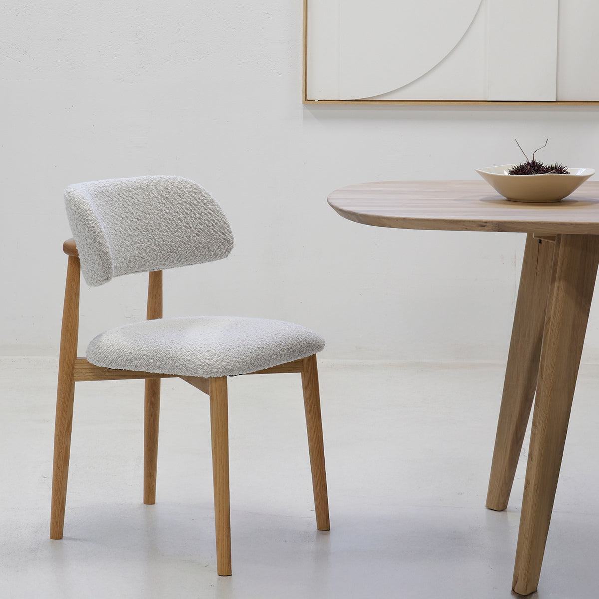 Materiaal: De Lexi-stoel is vervaardigd uit hoogwaardig eikenhout en bekleed met een zachte stof/textiel zitting. Dit zorgt niet alleen voor een stevige constructie maar ook voor een comfortabele zitervaring. Het gebruik van eikenhout geeft de stoel een robuuste uitstraling en een lange levensduur.