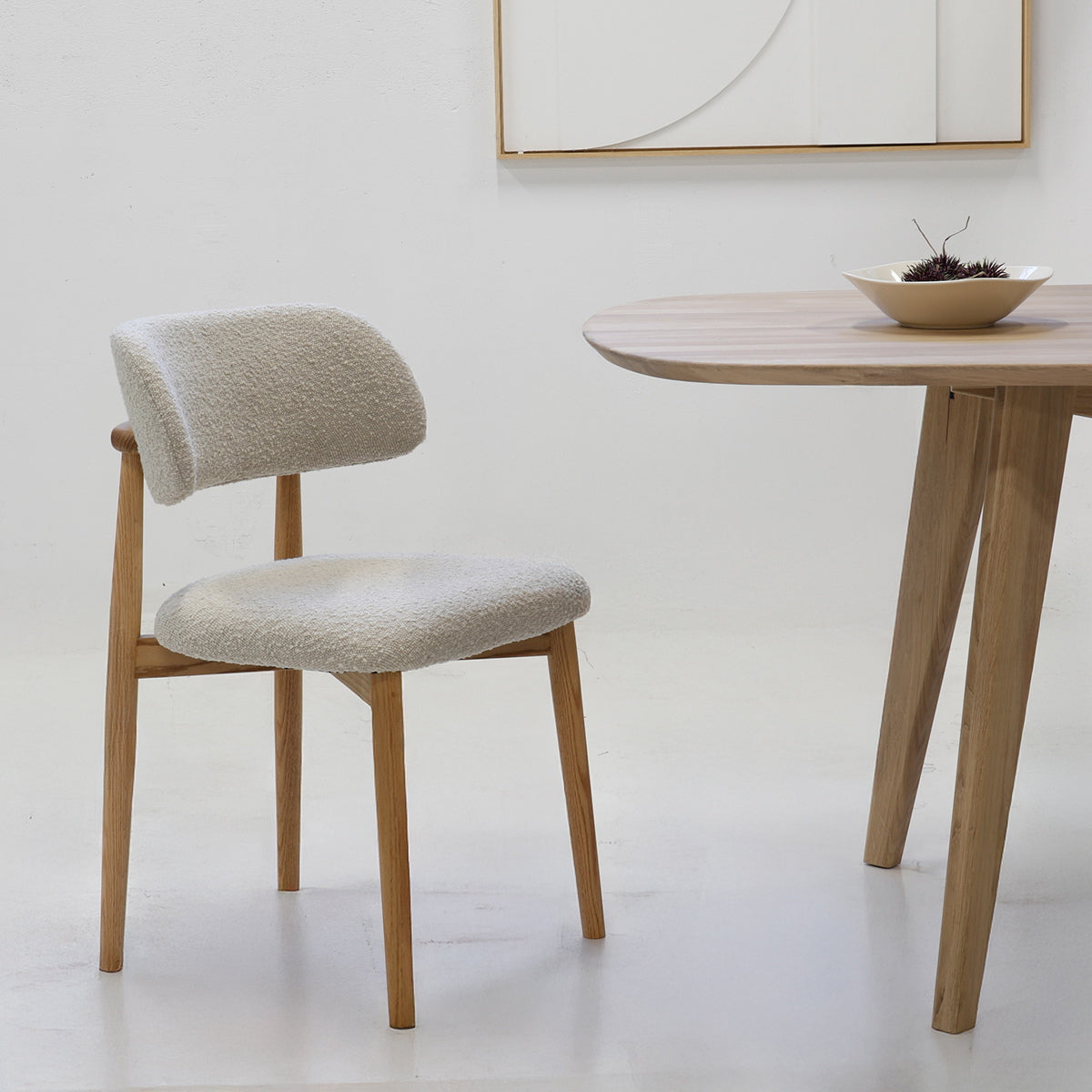 Materiaal: De Lexi stoel is gemaakt van eikenhout voor de basisstructuur, wat zorgt voor een stevige en duurzame constructie. De zitting is bekleed met een hoogwaardige stof/textiel, wat een zachte en comfortabele zitervaring biedt. Deze combinatie van materialen maakt de stoel zowel stijlvol als functioneel.