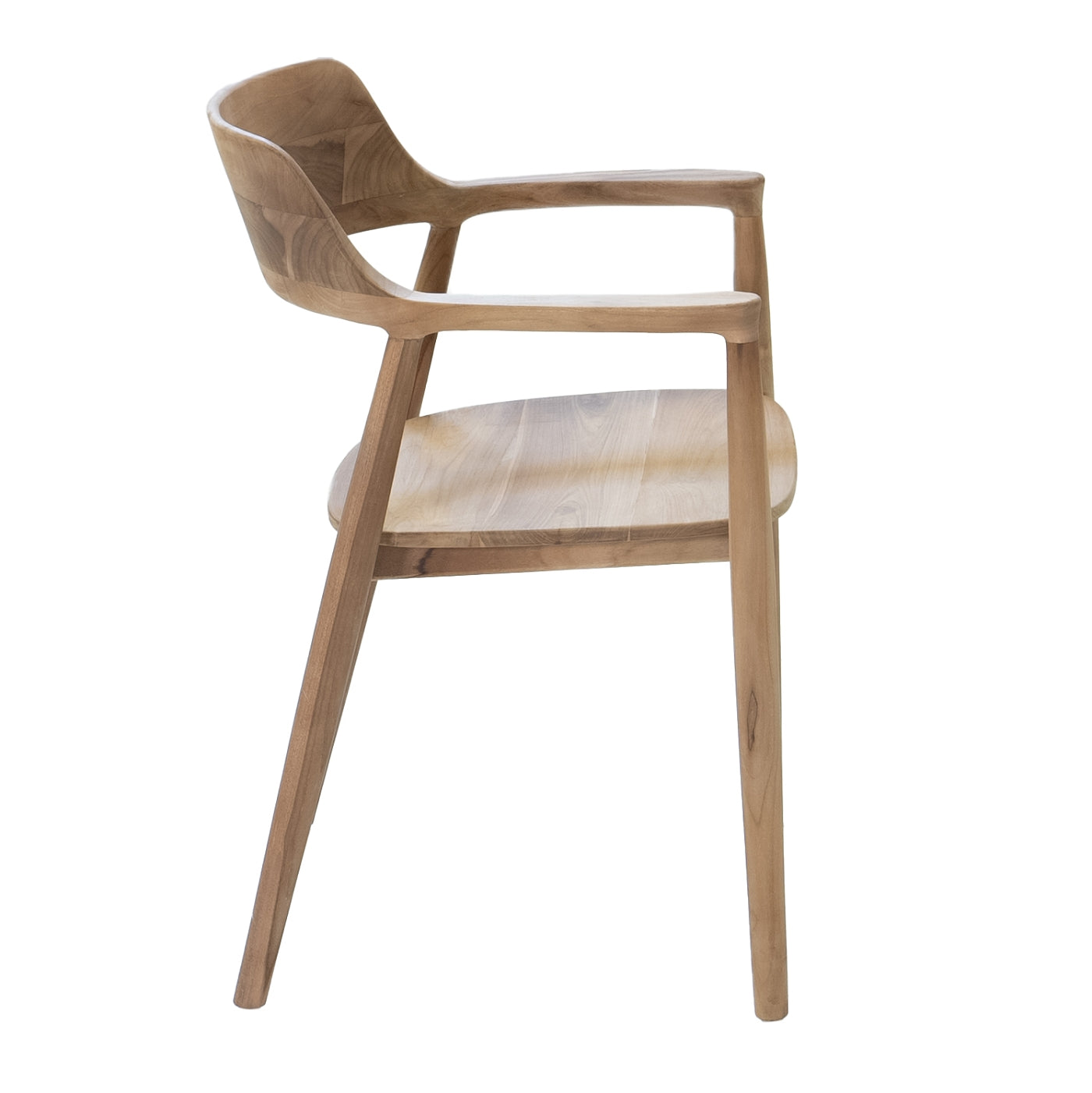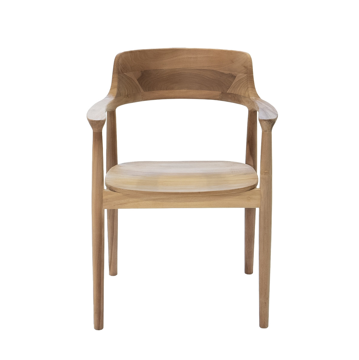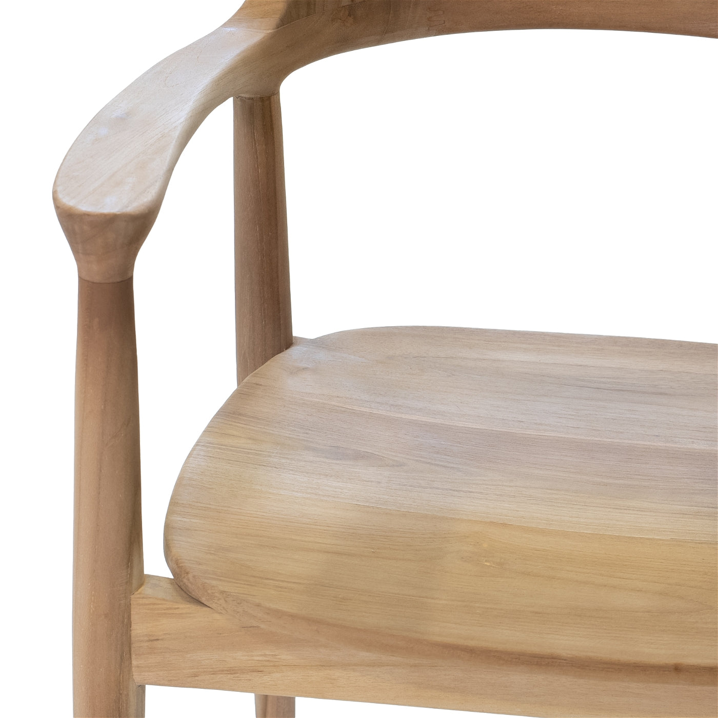 Materiaal: De stoel is volledig gemaakt van teakhout, bekend om zijn duurzaamheid en natuurlijke uitstraling. Dit materiaal zorgt voor een warme en uitnodigende sfeer in elke ruimte.