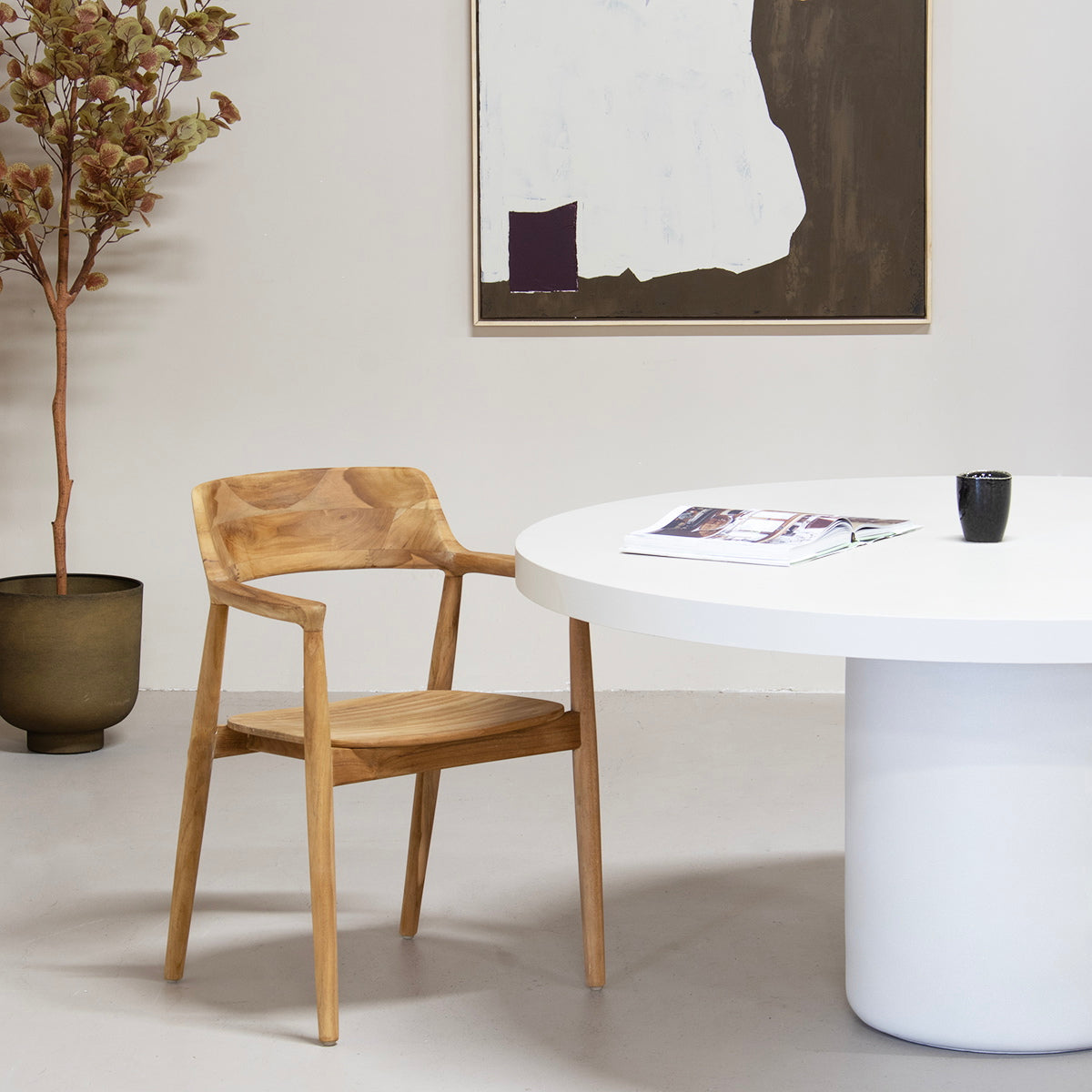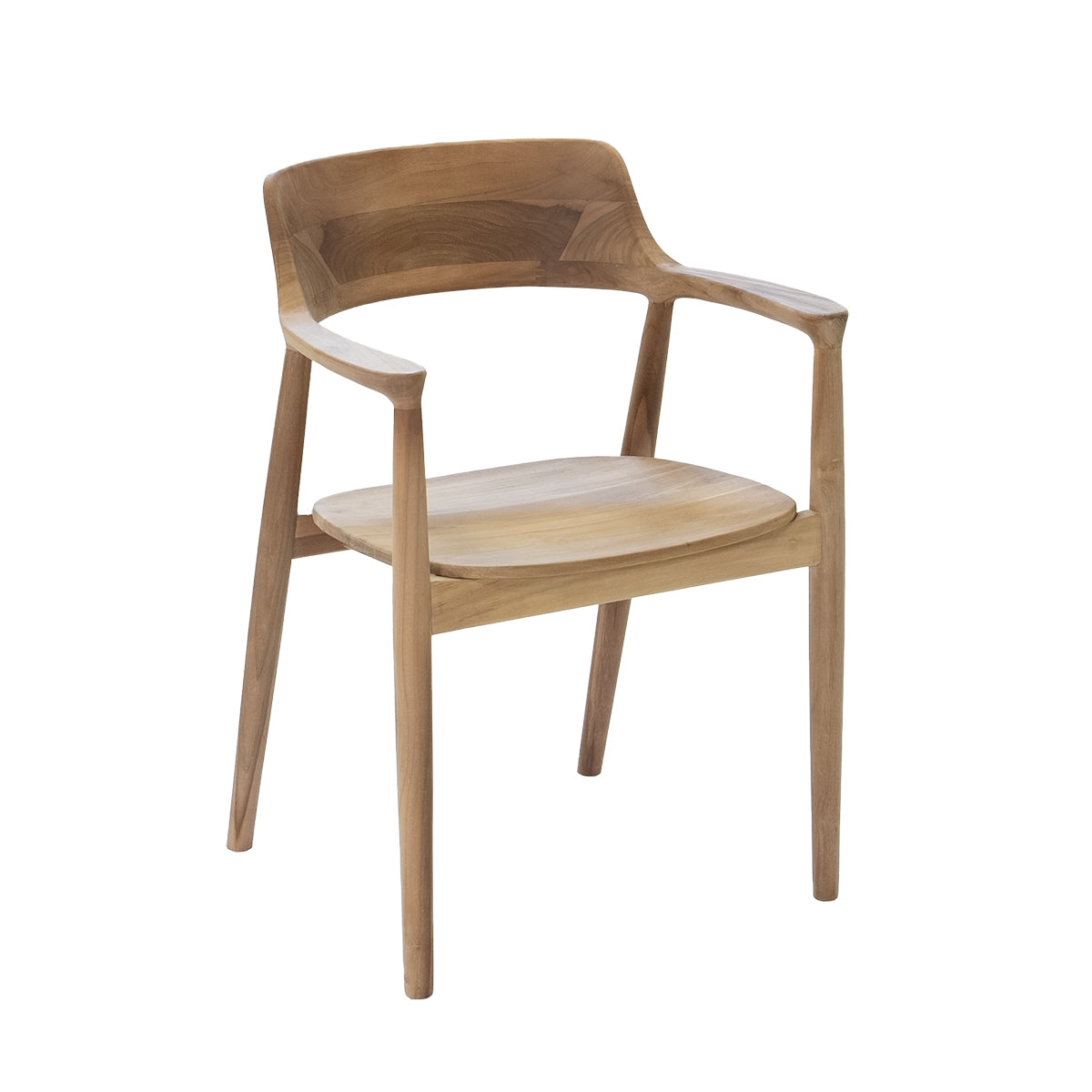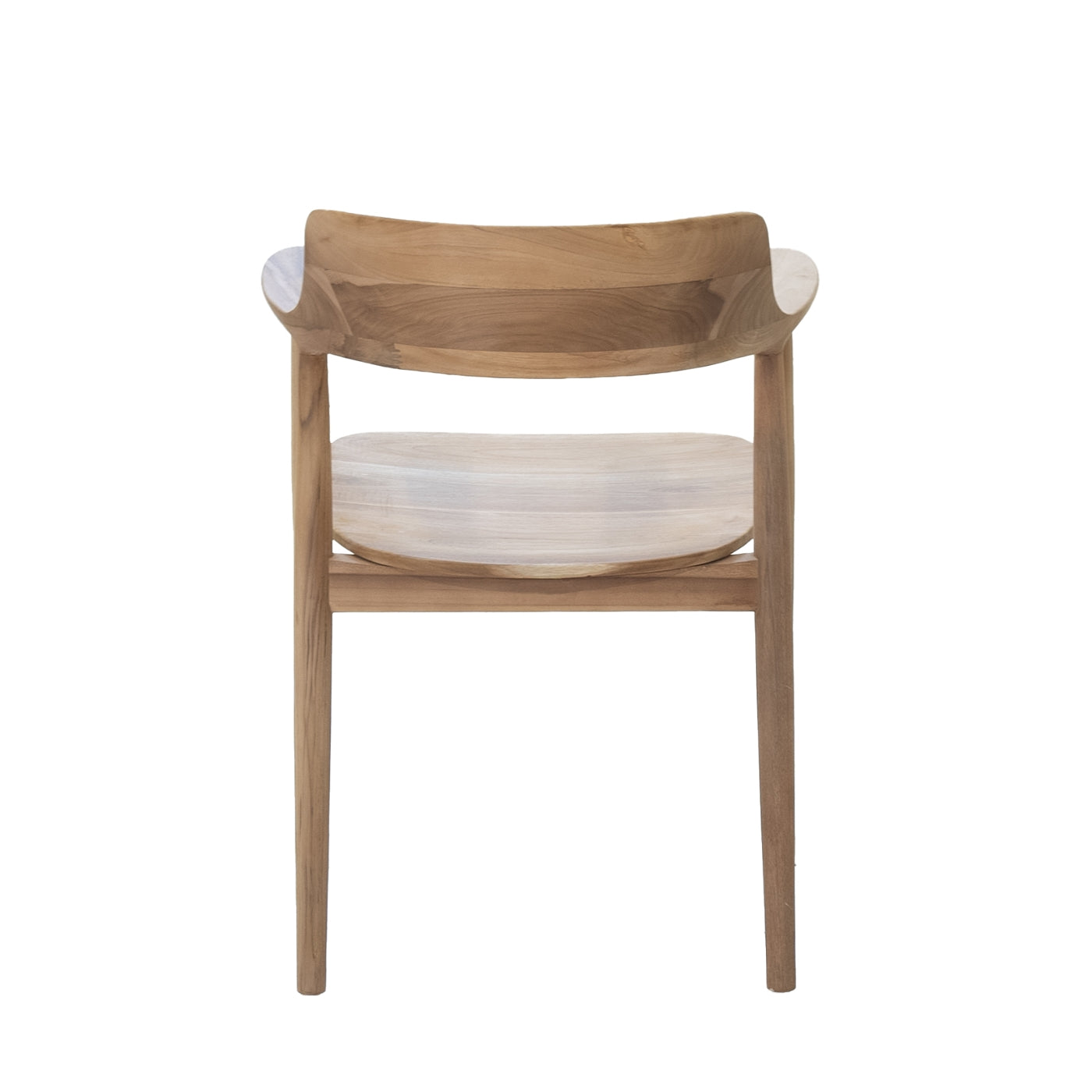 Materiaal: De stoel is volledig gemaakt van teakhout, bekend om zijn duurzaamheid en natuurlijke uitstraling. Dit materiaal zorgt voor een warme en uitnodigende sfeer in elke ruimte.