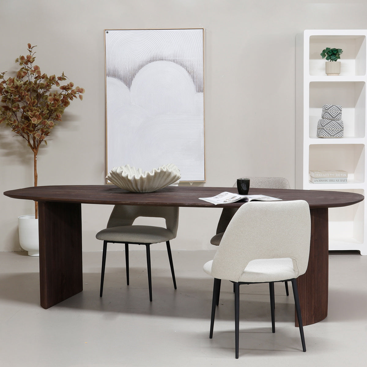 Ontdek de charme van Scandinavisch design met de Eettafel Feline in donkerbruin. Deze tafel, vervaardigd uit hoogwaardig mangohout, belichaamt een tijdloze stijl die perfect past in elk interieur. Het donkerbruine kleurenpalet en de unieke Deens ovale vorm maken deze tafel tot een ware eyecatcher in jouw eetkamer. De geborstelde afwerking van het tafelblad voegt een extra dimensie van textuur en diepte toe, terwijl de solide constructie zorgt voor duurzaamheid en stabiliteit.