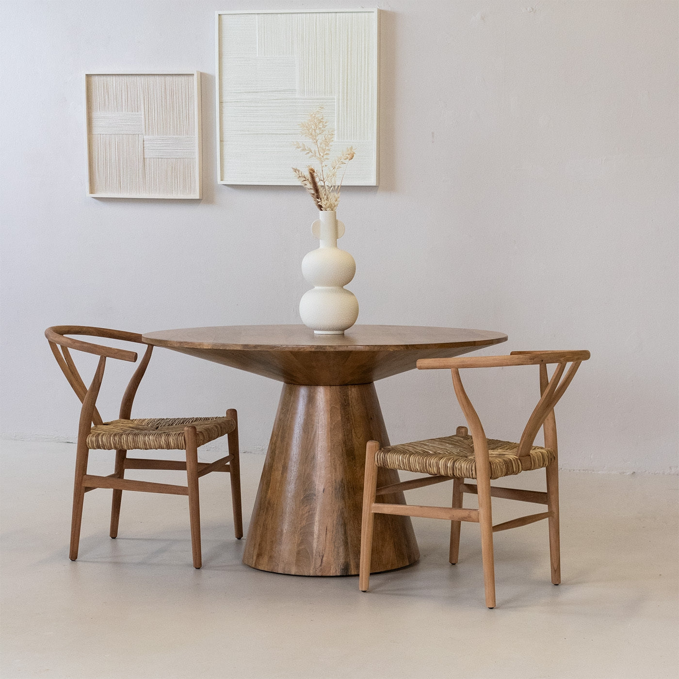 Materiaal: De tafel is volledig gemaakt van mangohout, zowel het tafelblad als het onderstel. Dit natuurlijke materiaal staat bekend om zijn stevigheid en warme uitstraling.