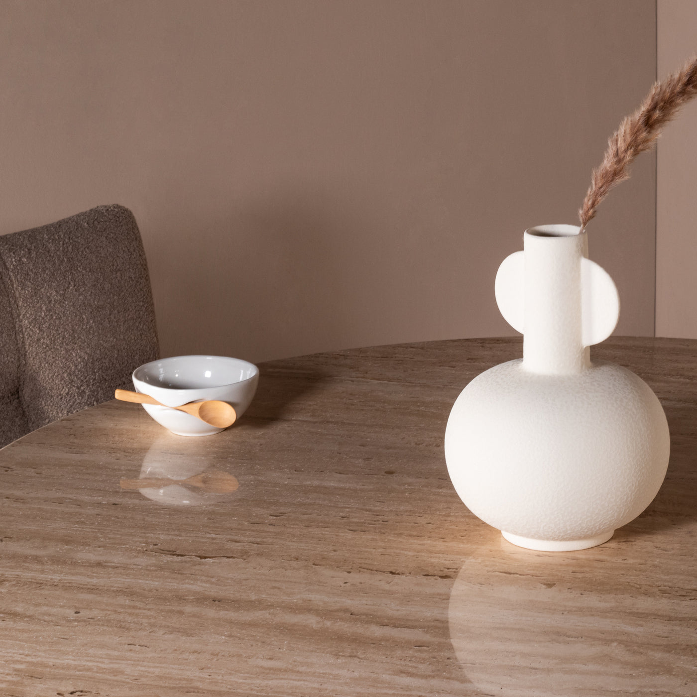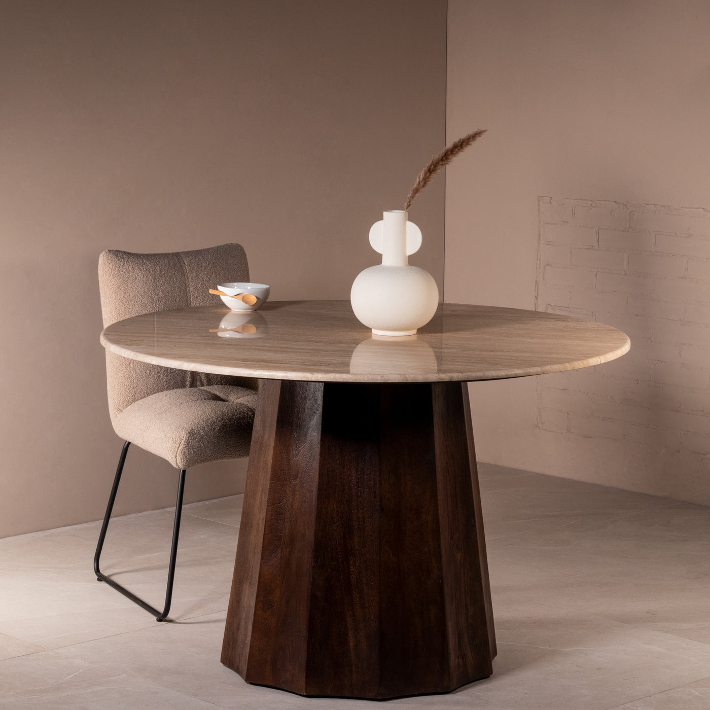 Ontdek de perfecte combinatie van stijl en functionaliteit met de Eettafel Lucio in een prachtige bruine travertin uitvoering. Deze tafel, geïnspireerd door de Japandi stijl, brengt een vleugje rust en eenvoud in elke eetruimte. Het gebruik van hoogwaardig travertin voor het tafelblad en stevig mangohout voor het onderstel, in combinatie met de gepolijste afwerking en de ronde vorm, maakt deze tafel tot een ware eyecatcher. De kwaliteit en het unieke ontwerp zorgen ervoor dat je jarenlang van deze tafel kunt genieten.