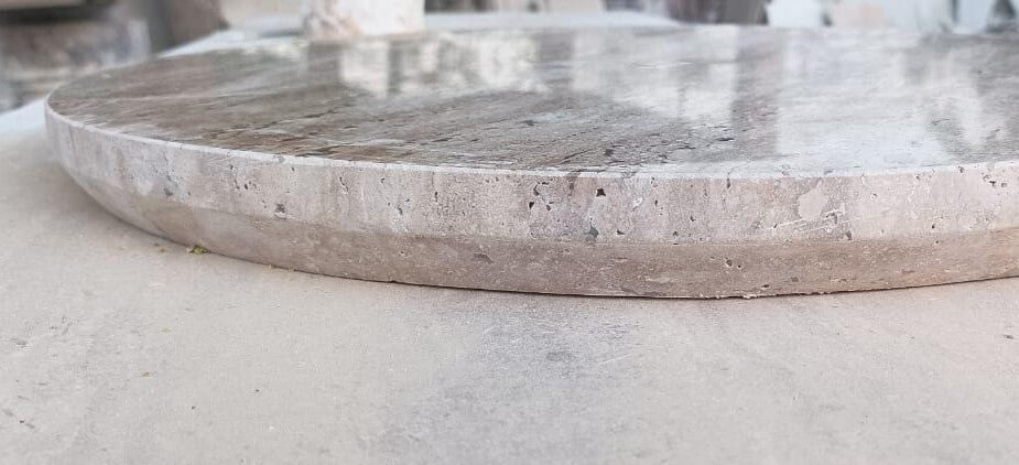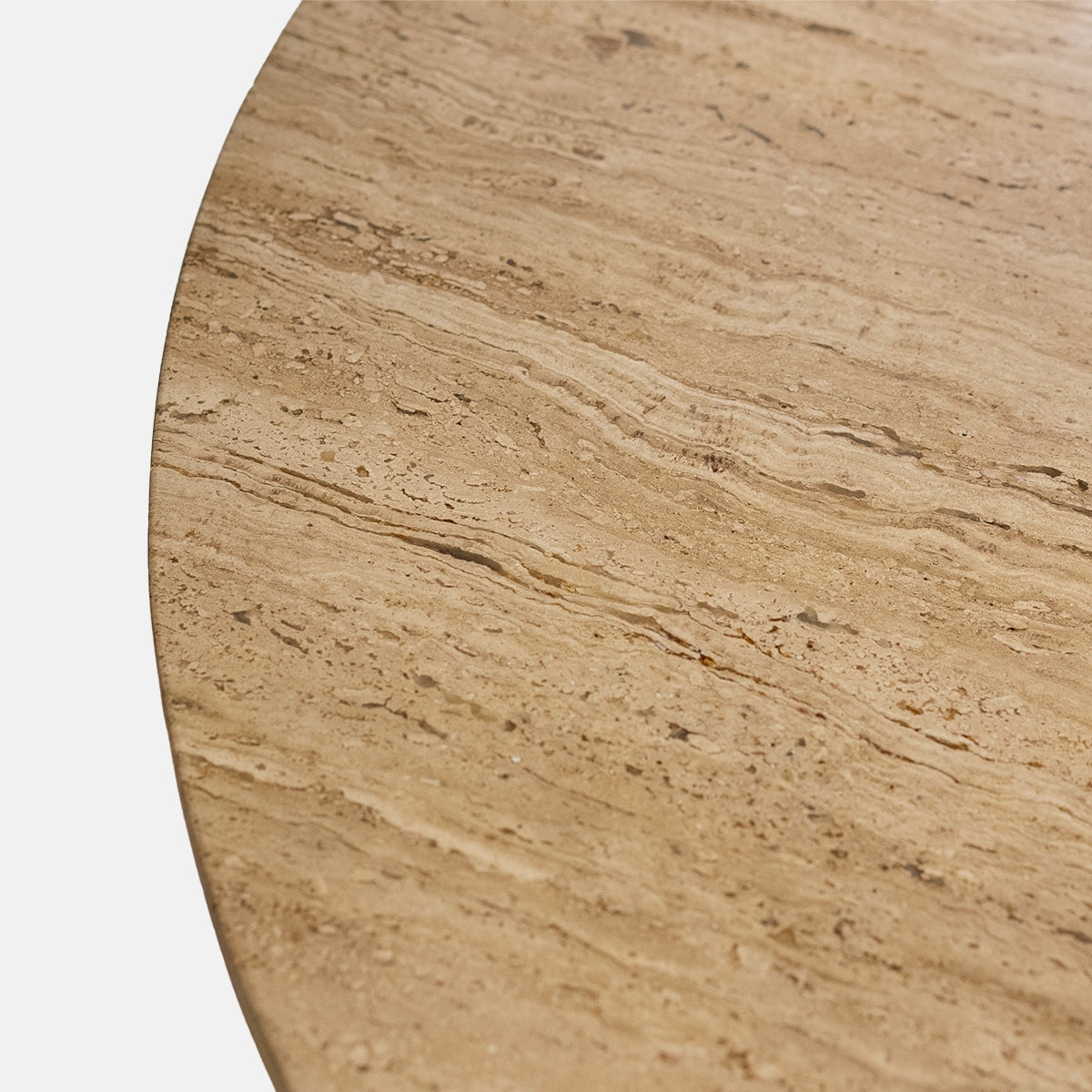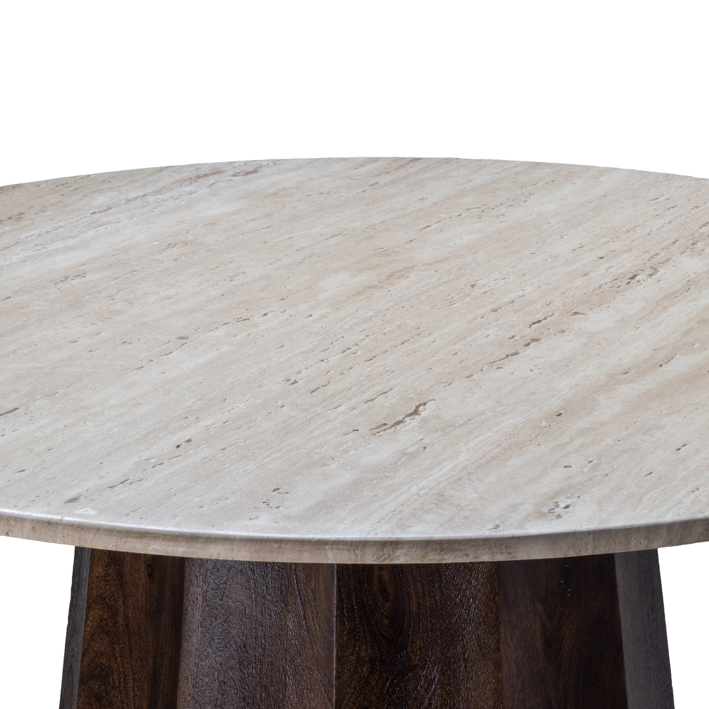 Materiaal: Het tafelblad is gemaakt van travertin, een prachtig natuursteen dat duurzaamheid en een unieke uitstraling biedt. Het onderstel is vervaardigd uit mangohout, bekend om zijn stevigheid en warme bruine kleur.