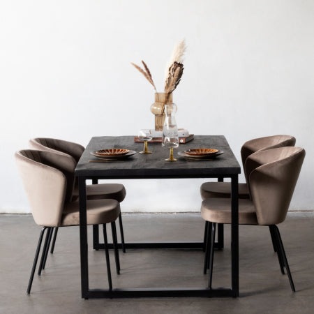 Materiaal: De tafel combineert mangohout met een metaal onderstel, wat zorgt voor een stevige constructie en een unieke uitstraling. Het mangohouten tafelblad is gelakt voor extra bescherming en een verfijnde finish.