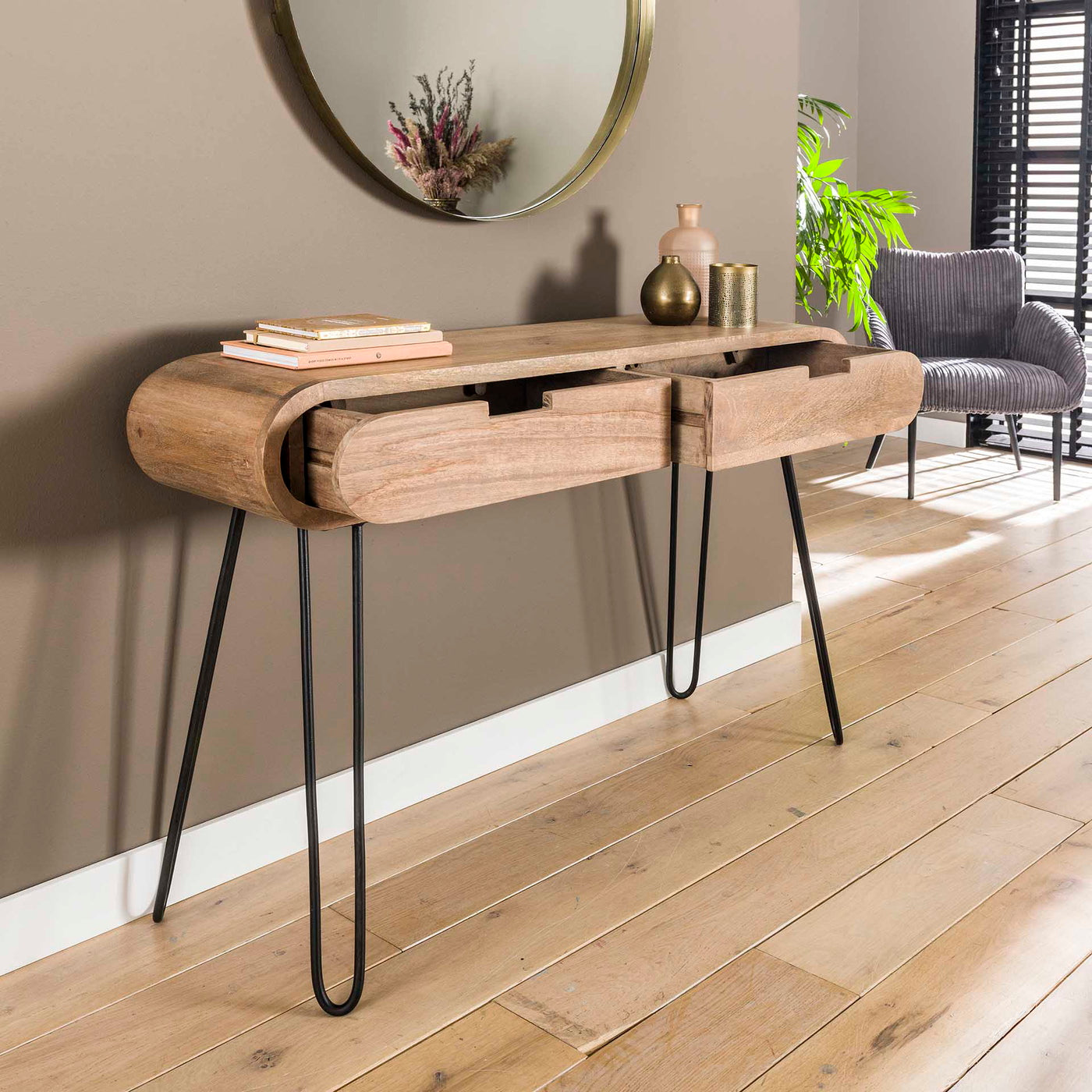 Deze kaptafel biedt voldoende ruimte voor al je make-up en accessoires, terwijl hij dankzij zijn compacte formaat gemakkelijk in elke kamer past. Je kunt de Kaptafel Barrel 2 Laden Massief Mango Sand.