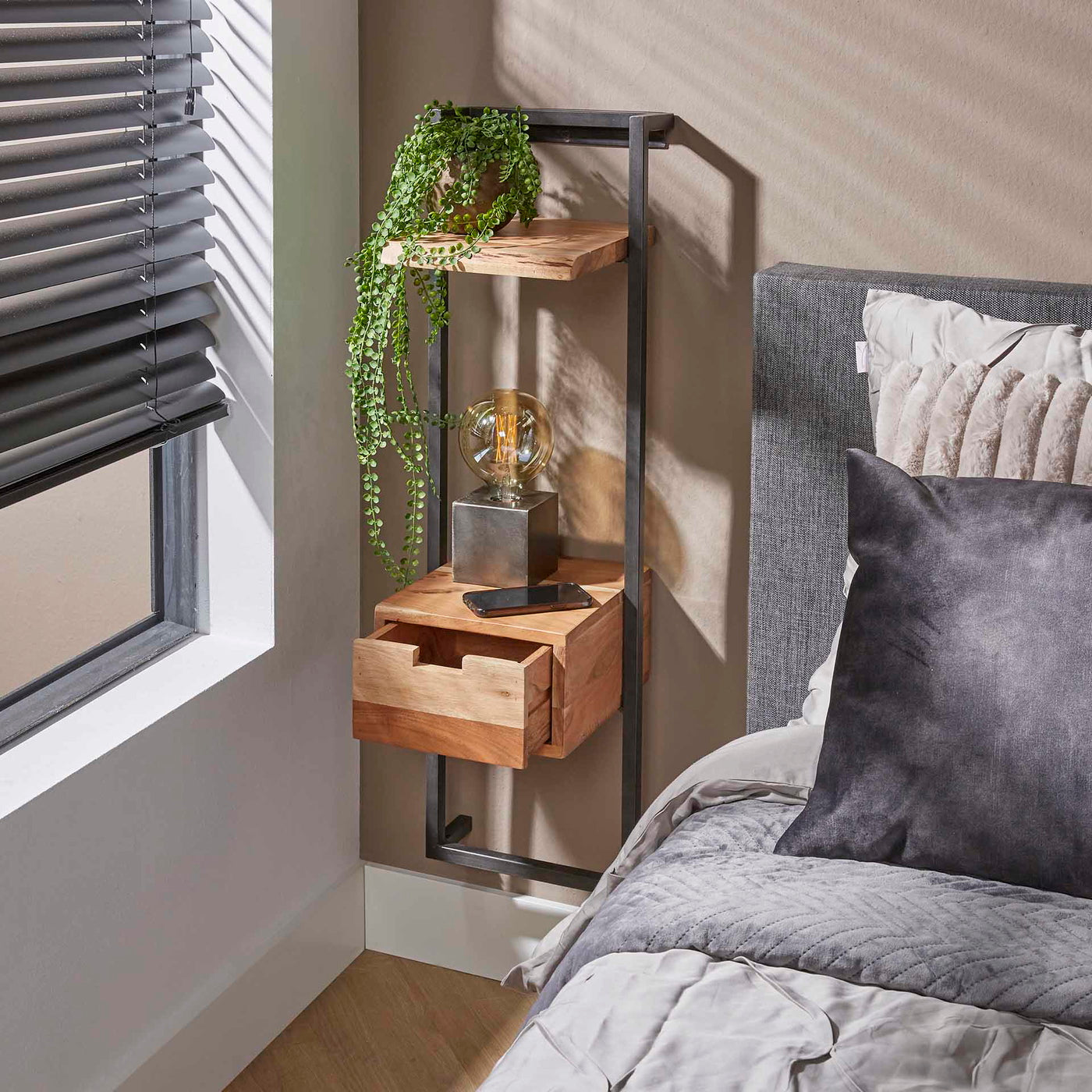 Materiaal: Het nachtkastje is gemaakt van massief acaciahout en metaal. Acaciahout staat bekend om zijn duurzaamheid en mooie nerfstructuur, terwijl het metalen frame zorgt voor extra stevigheid en een industriële touch.