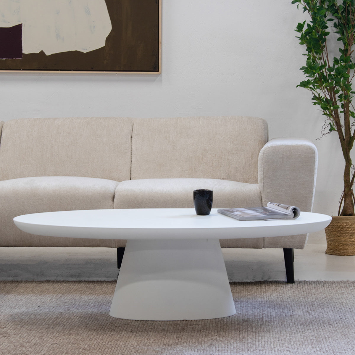 De Salontafel Cleo Ovaal Wit 130cm van Giga Meubel is een prachtige toevoeging aan je moderne interieur. Deze stijlvolle salontafel heeft een elegant ovaal ontwerp en is uitgevoerd in een strakke witte kleur. Het tafelblad en onderstel zijn gemaakt van duurzaam eco composiet, wat niet alleen bijdraagt aan een milieuvriendelijke keuze, maar ook zorgt voor een robuuste en kwalitatieve afwerking. De betonlook afwerking van het tafelblad geeft een eigentijdse uitstraling die perfect past in een modern interieur. Deze salontafel is ideaal voor dagelijks gebruik en biedt voldoende ruimte voor al je woonaccessoires.
