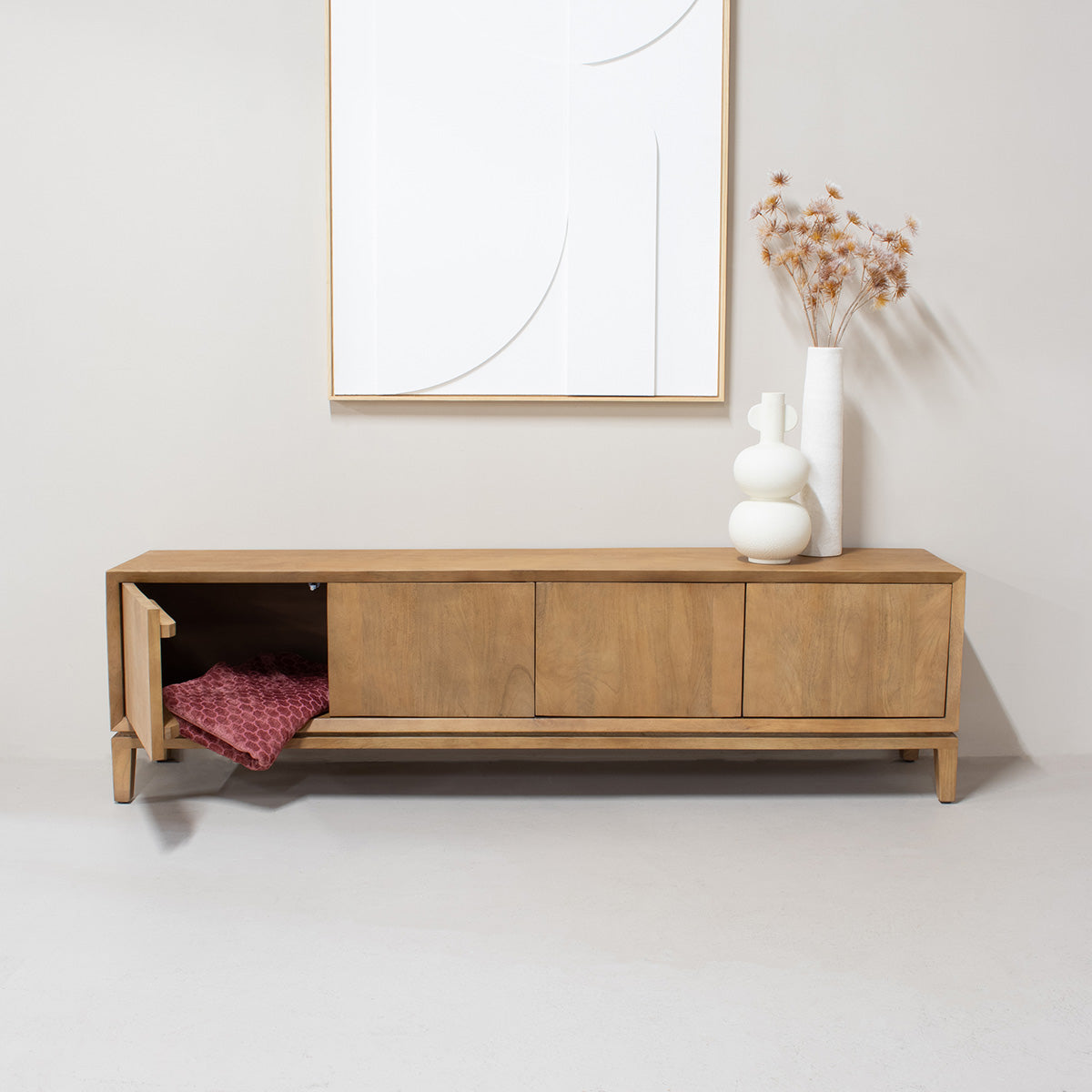 Ontdek de charme van het Tv-meubel Juno in een prachtige lichtbruine kleur, perfect voor jouw Scandinavisch interieur. Dit meubelstuk is vervaardigd uit hoogwaardig mangohout, wat niet alleen een warme uitstraling geeft, maar ook duurzaamheid garandeert. De lichte kleur zorgt ervoor dat het meubel naadloos in elke ruimte past, terwijl de kwaliteit en functionaliteit ervoor zorgen dat je jarenlang plezier zult hebben van dit meubel. Het is een ideale keuze voor wie op zoek is naar een stijlvolle en praktische oplossing voor het opbergen van media-apparatuur.
