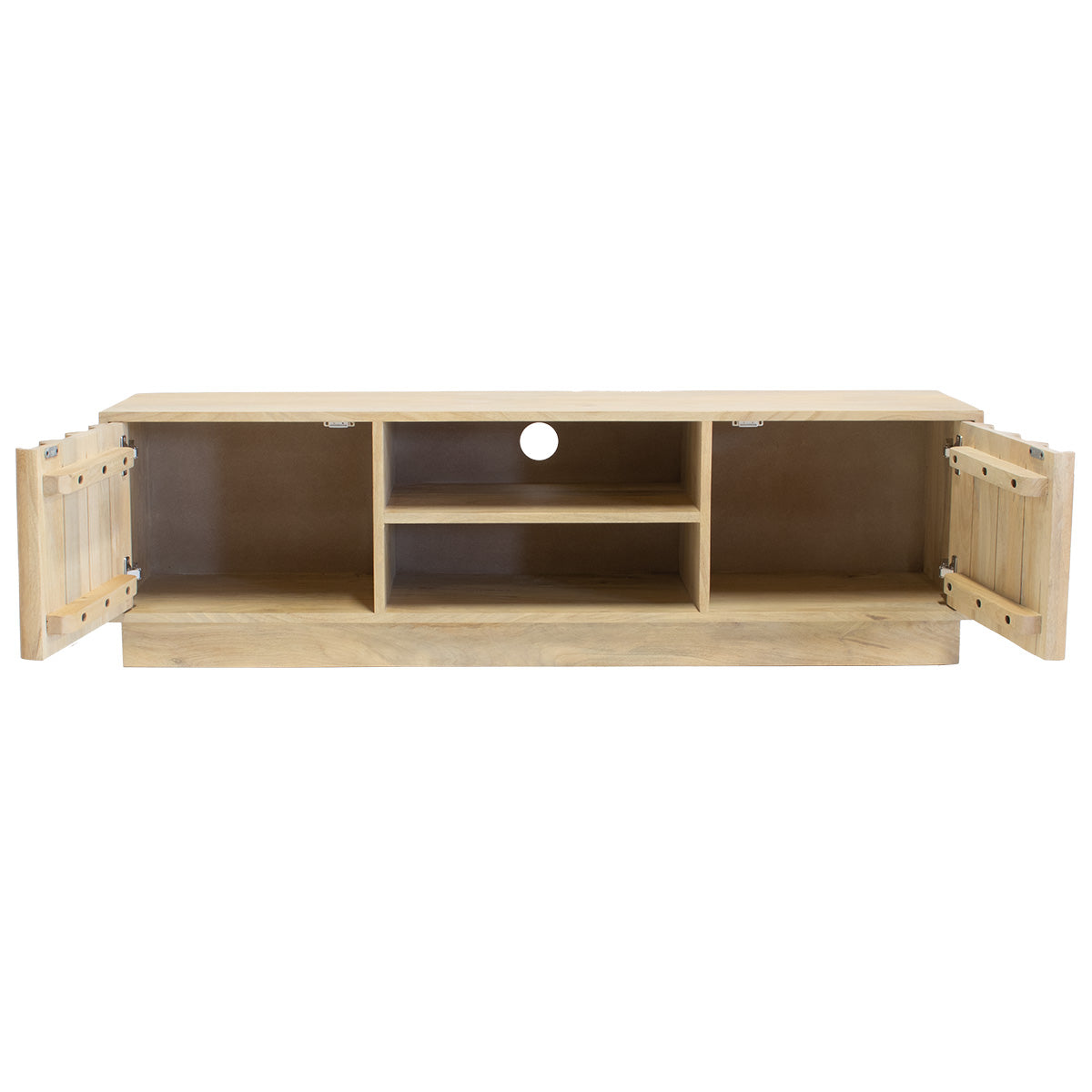 Materiaal: Het Tv-meubel Nika is gemaakt van mangohout, een duurzaam materiaal dat bekend staat om zijn robuustheid en unieke nerfpatronen. Dit houtsoort is niet alleen sterk, maar ook milieuvriendelijk, waardoor het een verantwoorde keuze is voor je interieur.