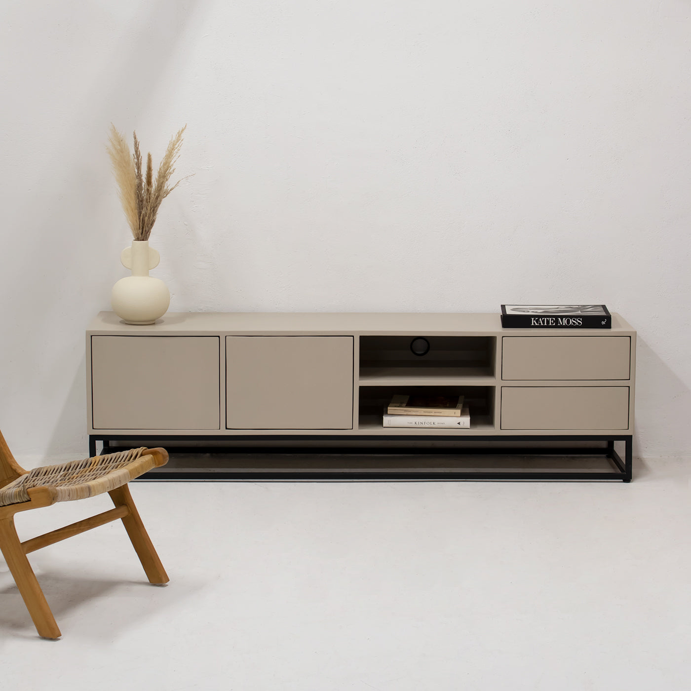 Dit industriële Tv-meubel Cervi in de kleur taupe is de perfecte toevoeging aan jouw woonkamer. De combinatie van mangohout en metaal geeft het meubel een stoere uitstraling, terwijl de taupe kleur zorgt voor een warme sfeer. Met een lengte van 180 cm biedt dit meubel voldoende ruimte voor jouw televisie en andere media-apparatuur. De kwaliteit van het mangohout en metaal zorgt ervoor dat je lang van dit meubel kunt genieten. Het meubel is bovendien voorzien van twee lades, waardoor je extra opbergruimte hebt voor bijvoorbeeld afstandsbedieningen en tijdschriften.