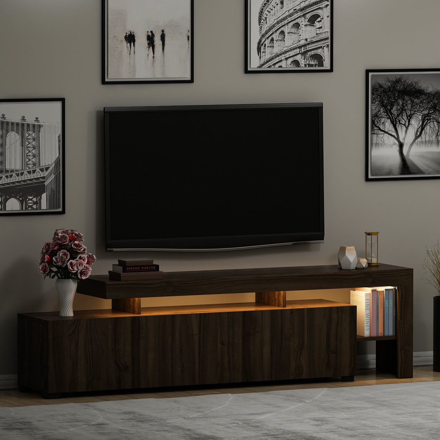 Onze tv-standaard is uitgerust met ledverlichting en voegt een betoverende gloed toe aan je entertainmentruimte. De subtiele verlichting verbetert de visuele aantrekkingskracht van je tv en creëert een betoverende sfeer die je onderdompelt in je favoriete films en shows.