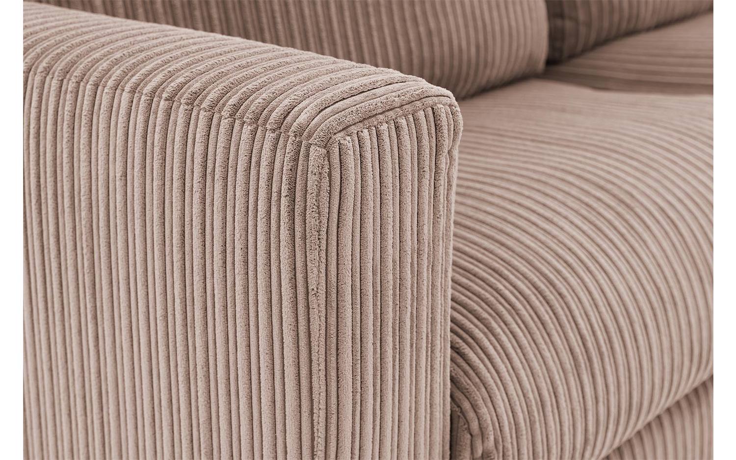 De ribstof in warme mokkakleur geeft deze driezitsbank een eigentijdse landelijke uitstraling. De structuur van de ribstof zorgt voor een speels effect dat mooi past bij verschillende interieurstijlen. De kunststof poten in zwart vormen een subtiel, modern contrast met de warme bruintinten.