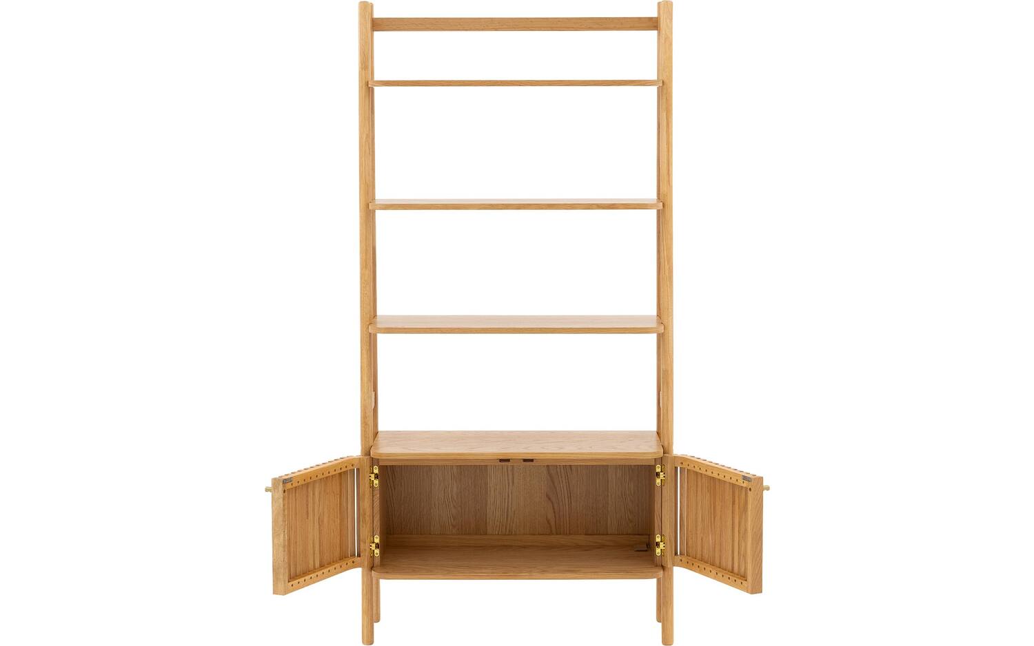 De bijzondere deuren met latjes zorgen voor een speels effect, terwijl je belangrijke spullen netjes uit het zicht bewaart. Achter de deuren vind je ruime opbergvakken voor boeken, spelletjes of andere persoonlijke items die je georganiseerd wilt houden.