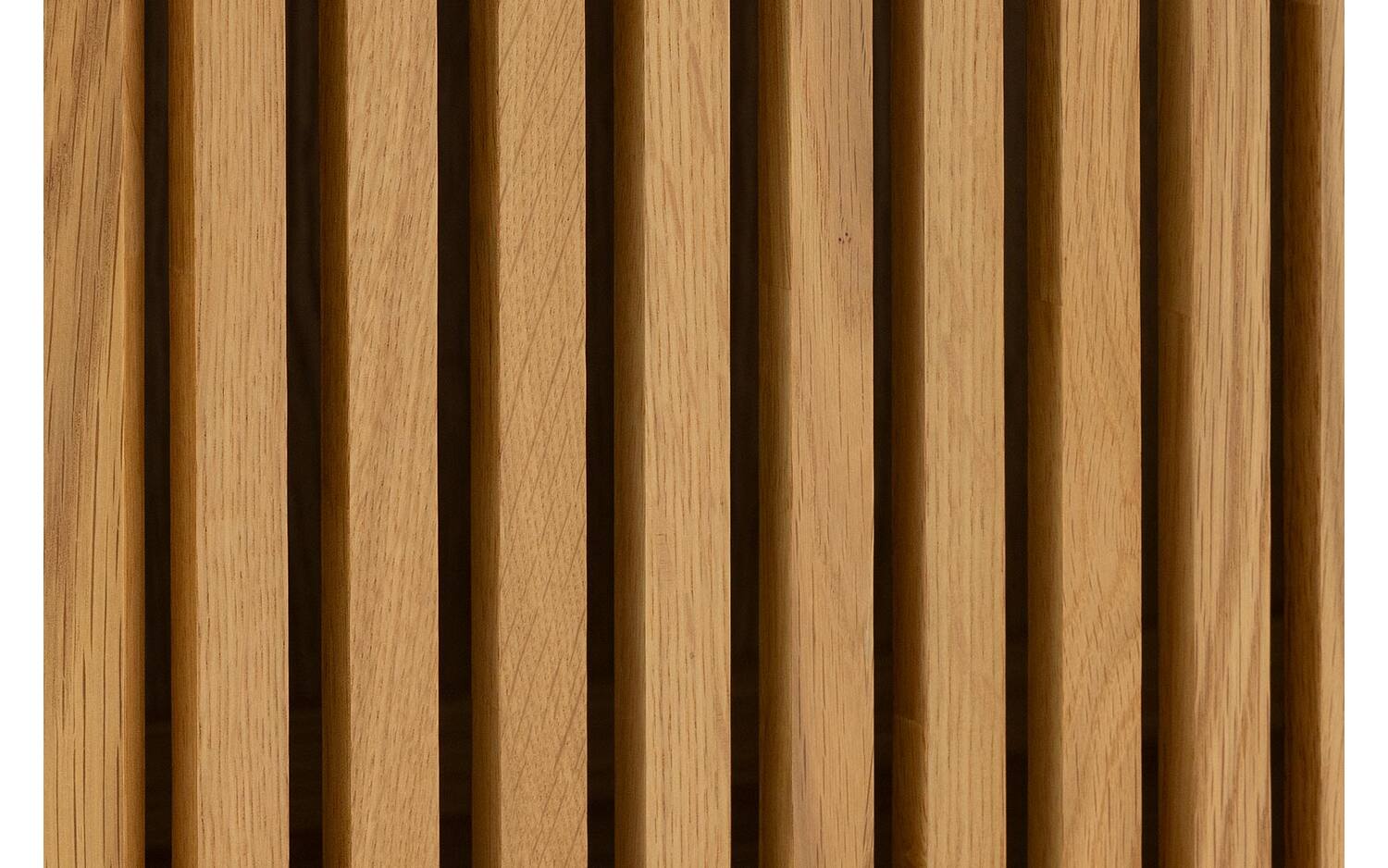 Het hoogwaardige eiken fineer met lakafwerking beschermt tegen kringen en vlekken, terwijl de natuurlijke houtnerfstructuur zichtbaar blijft. De praktische handgrepen maken het dagelijks gebruik eenvoudig en comfortabel.