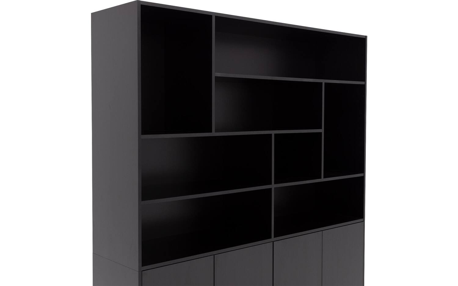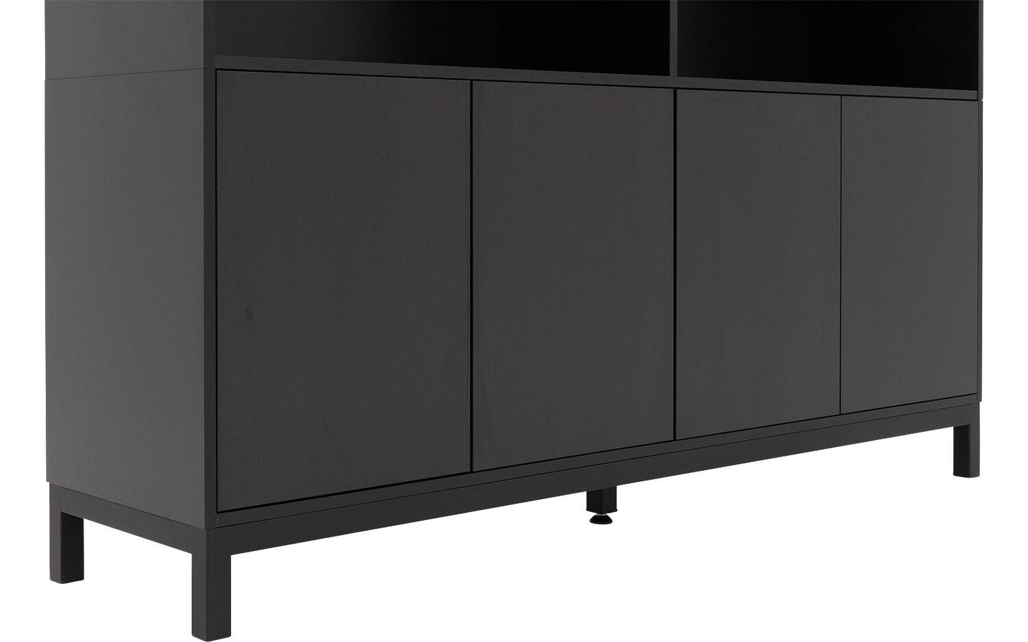 Buffetkast Valencia maakt indruk met zijn imposante formaat en stijlvolle zwarte kleur met realistische houtstructuur. Deze combinatie geeft je interieur direct een warme en natuurlijke uitstraling. De slimme indeling met open vakken en gesloten opbergruimte zorgt voor rust in je woonkamer.