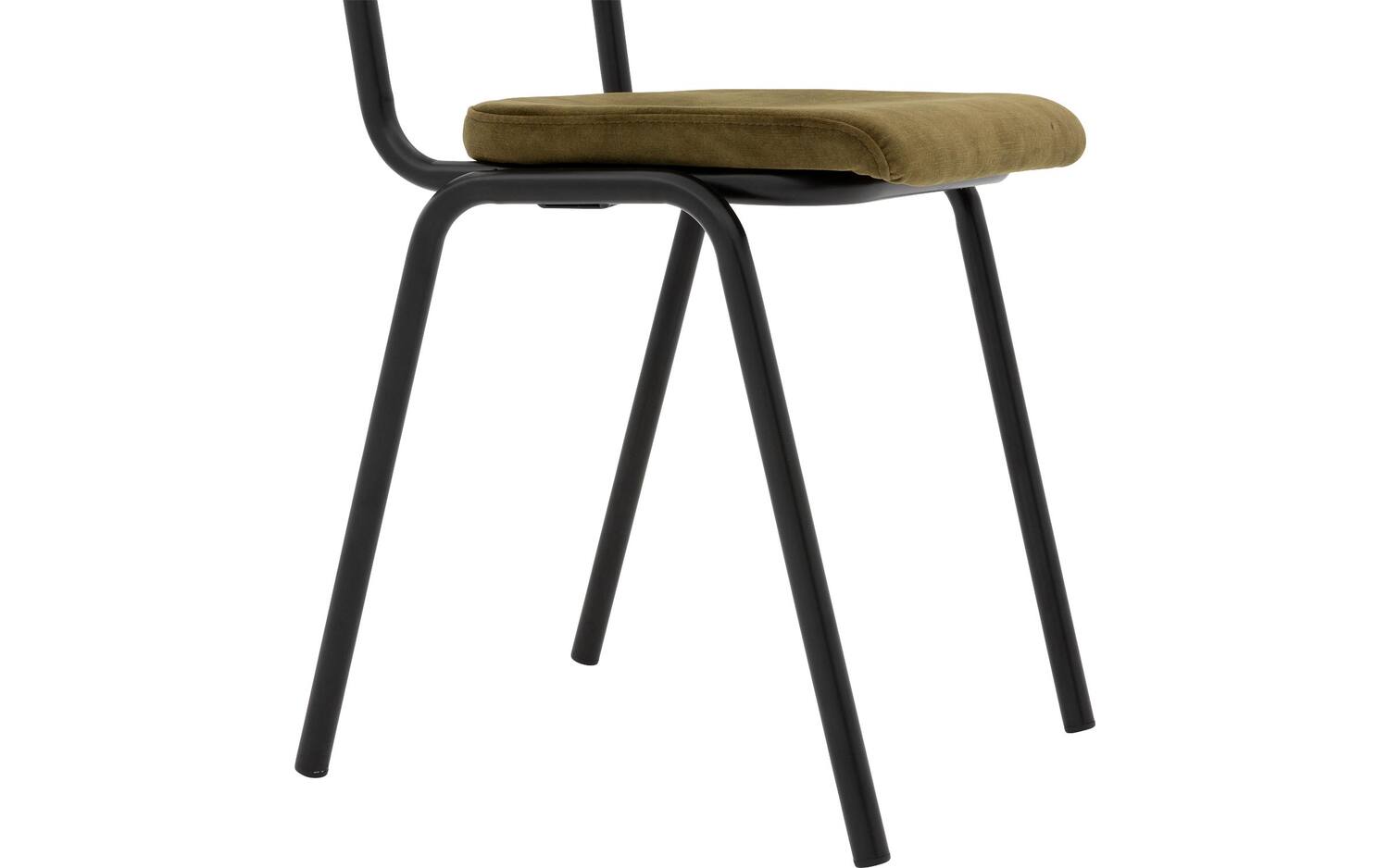 De stoel is vast gestoffeerd, wat zorgt voor een strakke en moderne look. Het ontwerp zonder armleuningen maakt deze eettafelstoel compact en praktisch voor kleinere eethoeken. De matte zwarte poten geven de stoel een industrieel tintje dat perfect past in een urban interieur.