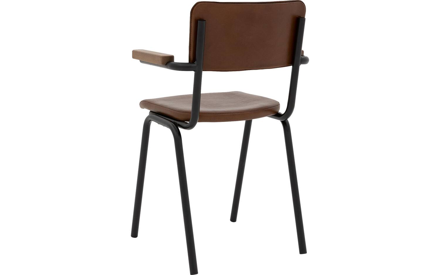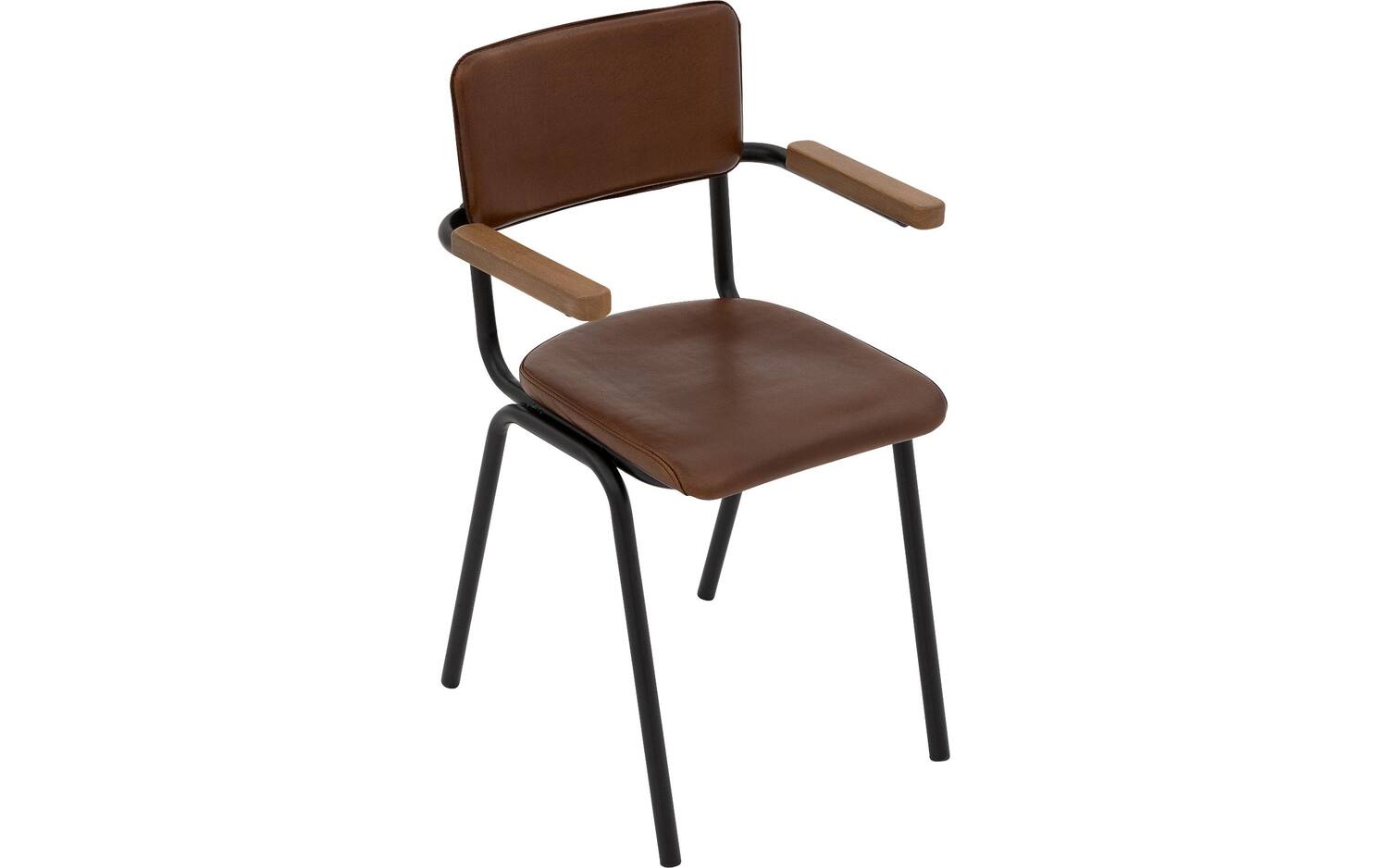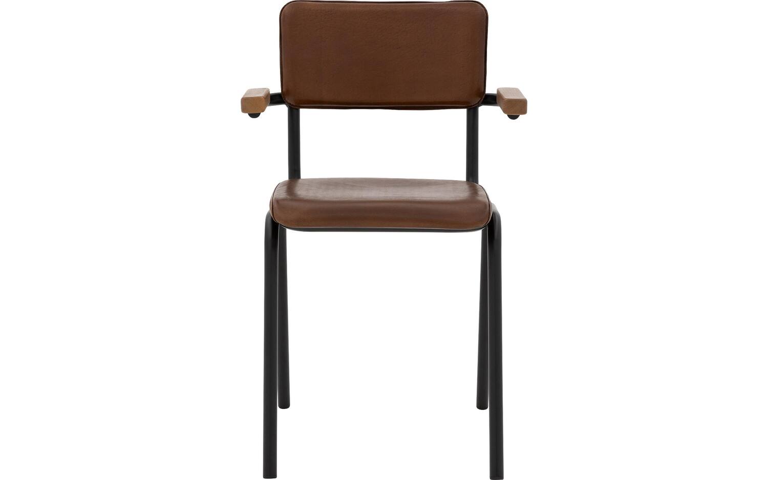Cognac leren eetkamerstoel Chaplin met armleuning combineert nostalgisch design met moderne functionaliteit. Deze vintage-geïnspireerde stoel doet denken aan een klassieke schoolstoel, maar geeft je eetkamer een stijlvolle, urban-industriële uitstraling. Het cognackleurige outdoor leer krijgt bij gebruik een nog mooiere nonchalante uitstraling. Voor zowel een snel ontbijt als uitgebreide diners met vrienden is deze elegante stoel een perfecte keuze.