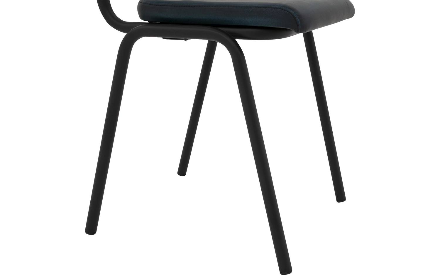 Het strakke zwart matte frame vormt een mooi contrast met de blauwe leren bekleding. De vaste stoffering geeft de stoel een moderne uitstraling, terwijl de compacte afmetingen (54 x 82 x 51 cm) maken dat deze eettafelstoel ook in kleinere ruimtes goed tot zijn recht komt.