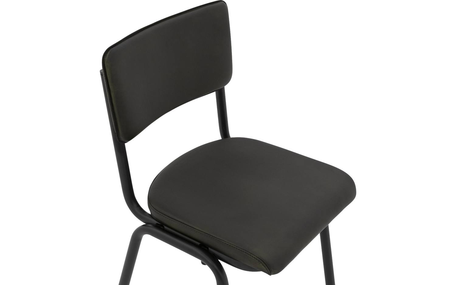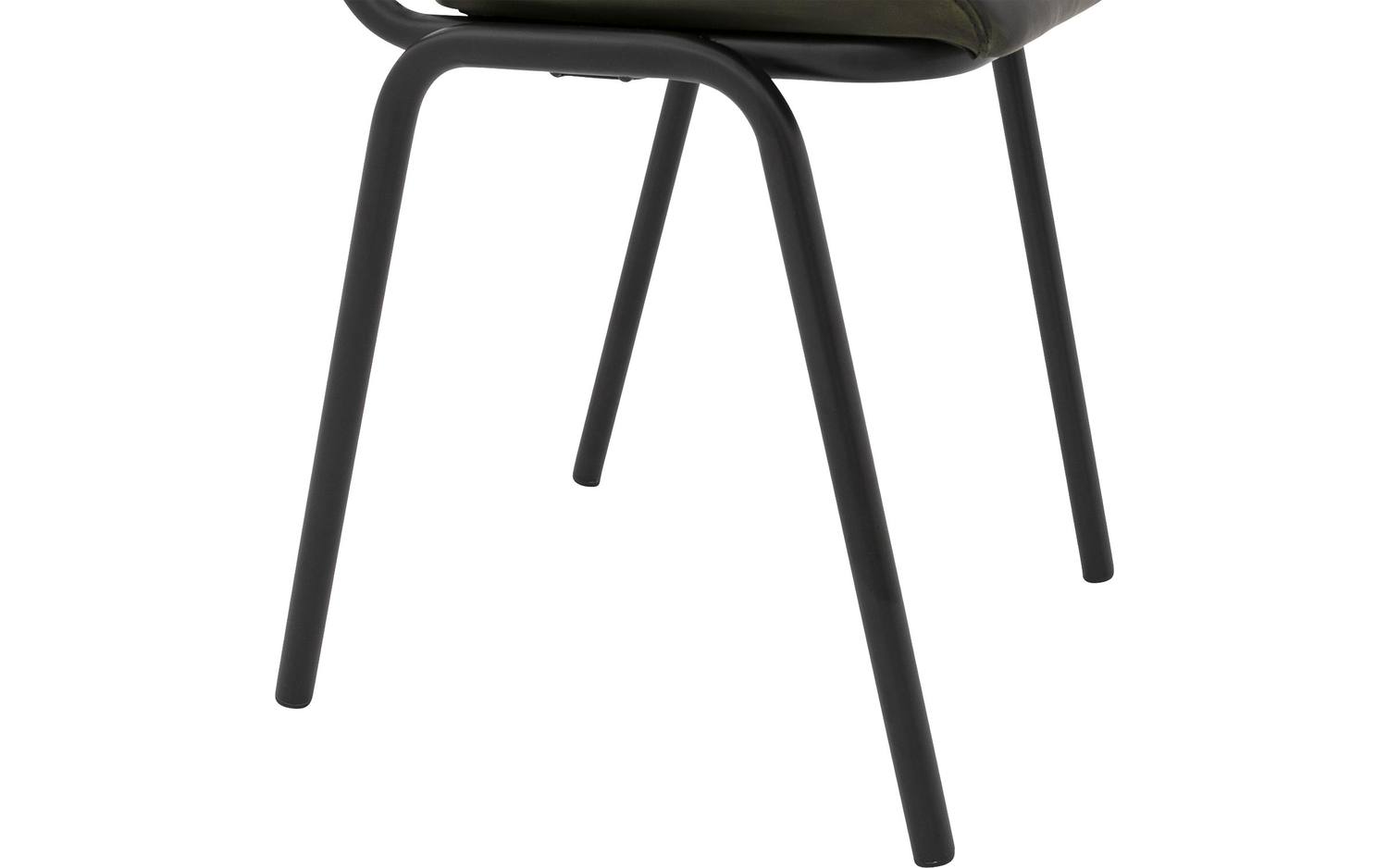 De zwart matte poten vormen een mooi contrast met de groene bekleding en geven de stoel een industriële touch. De poten hebben een diameter van 2 cm, wat zorgt voor een stijlvolle, slanke basis die de retro-uitstraling versterkt.
