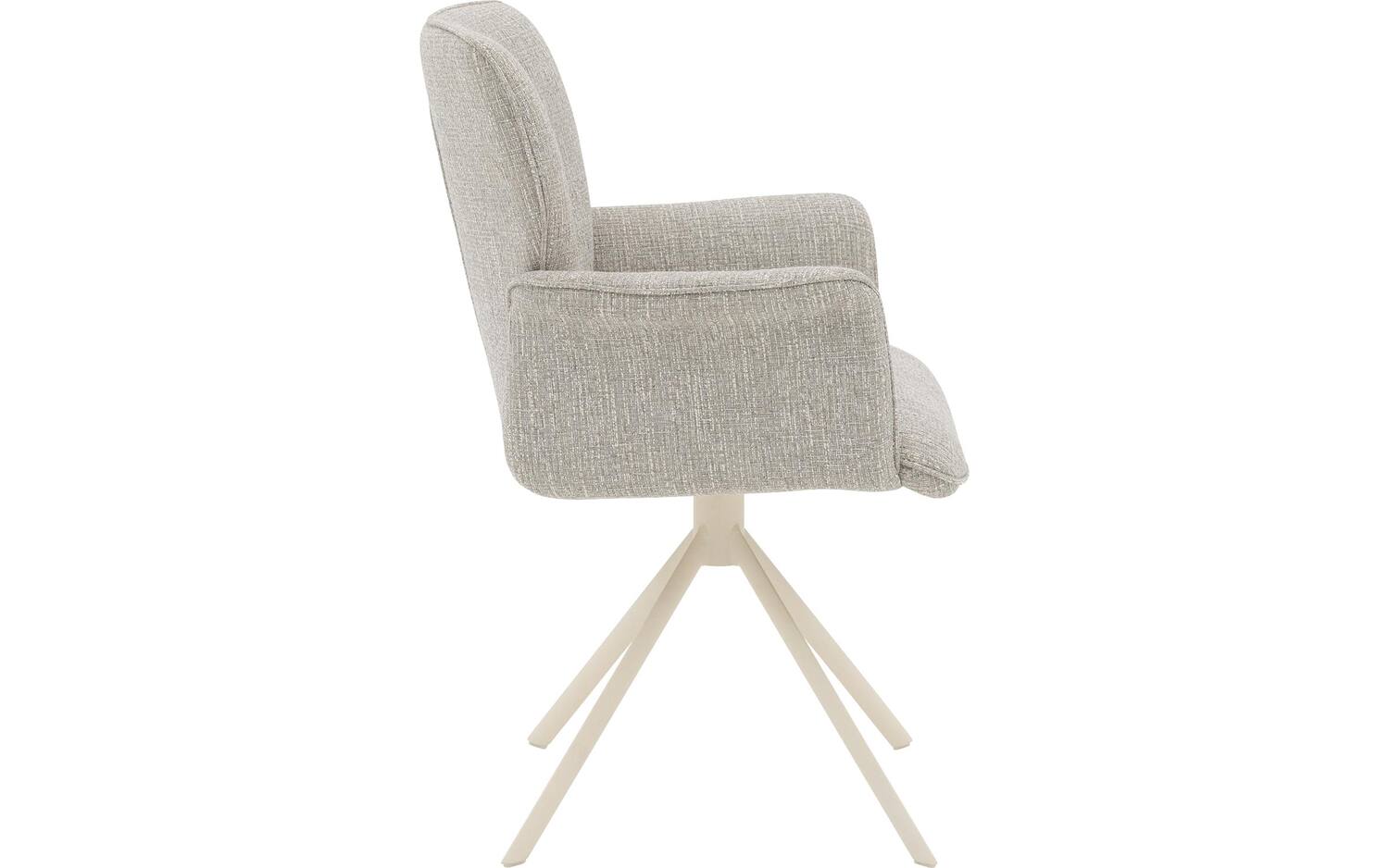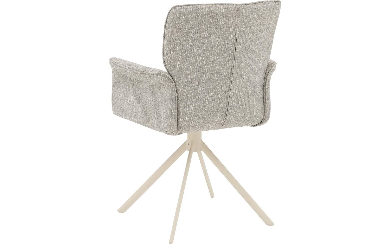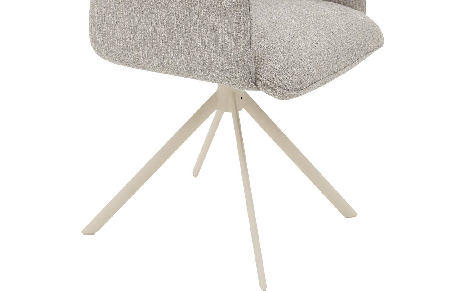 De witte spinpoot met poedercoating vormt een mooi contrast met de grijze stoffering. Deze onderstel is niet alleen een stijlvol element, maar maakt de stoel ook 360° draaibaar met returnfunctie. Na gebruik draait de stoel automatisch terug naar de oorspronkelijke positie, wat zorgt voor een opgeruimde uitstraling van je eetkamer.